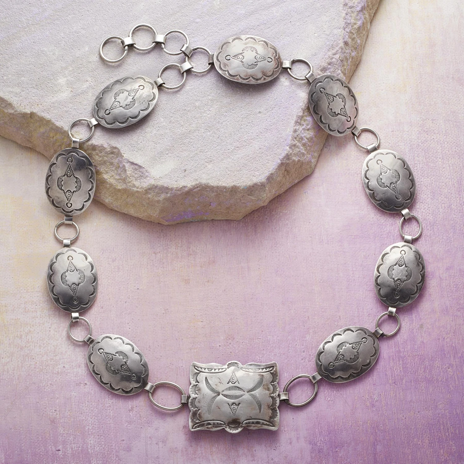 Sterling silver conchos are embellished with artful hand-stamped design and lead to a rectangular centerplate also exquisitely hand-stamped. Navajo made in the thirties and one of a kind. Hook-and-eye closure. 22″ to 24″L, center concho 1-3/4″ x 1-1/2″, oval conchos 1-3/8″ dia.