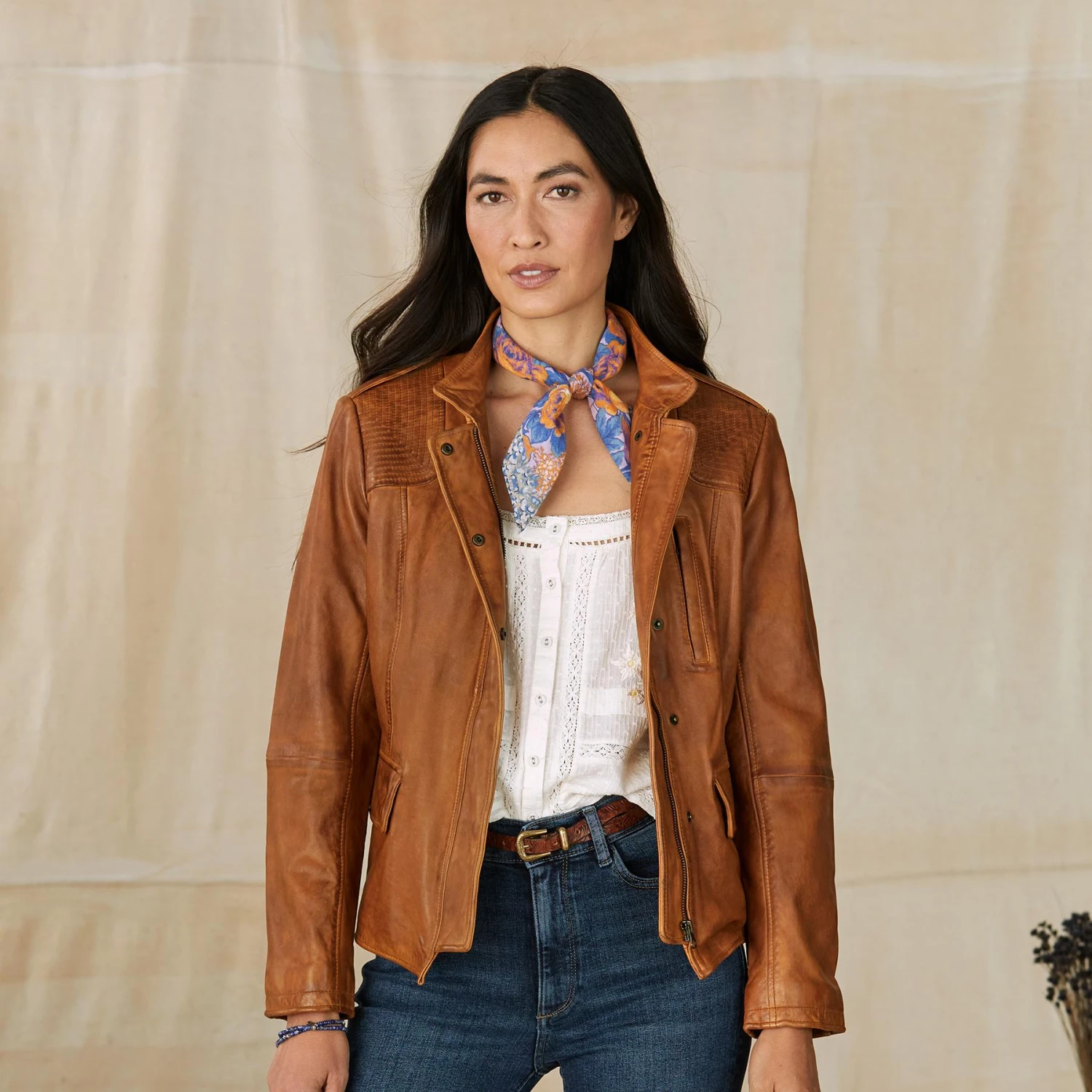 Rugged good looks meet refined design in this handcrafted, leather jacket featuring classic details that will keep this a wardrobe staple for years to come. Zipper and snap button closure. Professional leather clean. Imported. Exclusive. Sizes XS (0 to 2), S (4 to 6), M (8 to 10), L (12 to 14), XL (16 to 18), XXL (20 to 22). Front approx. 23-3/4″L.