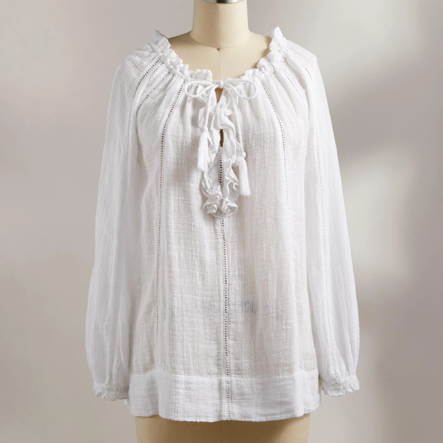 Embrace your artistic spirit in our sheer, easy-fit top with ladder lace, ruffle neckline and tassel ties. Cotton/viscose. Hand wash. Imported. Exclusive. Sizes XS (0 to 2), S (4 to 6), M (8 to 10), L (12 to 14), XL (16 to 18), XXL (20 to 22). Approx. 26-1/2″L.