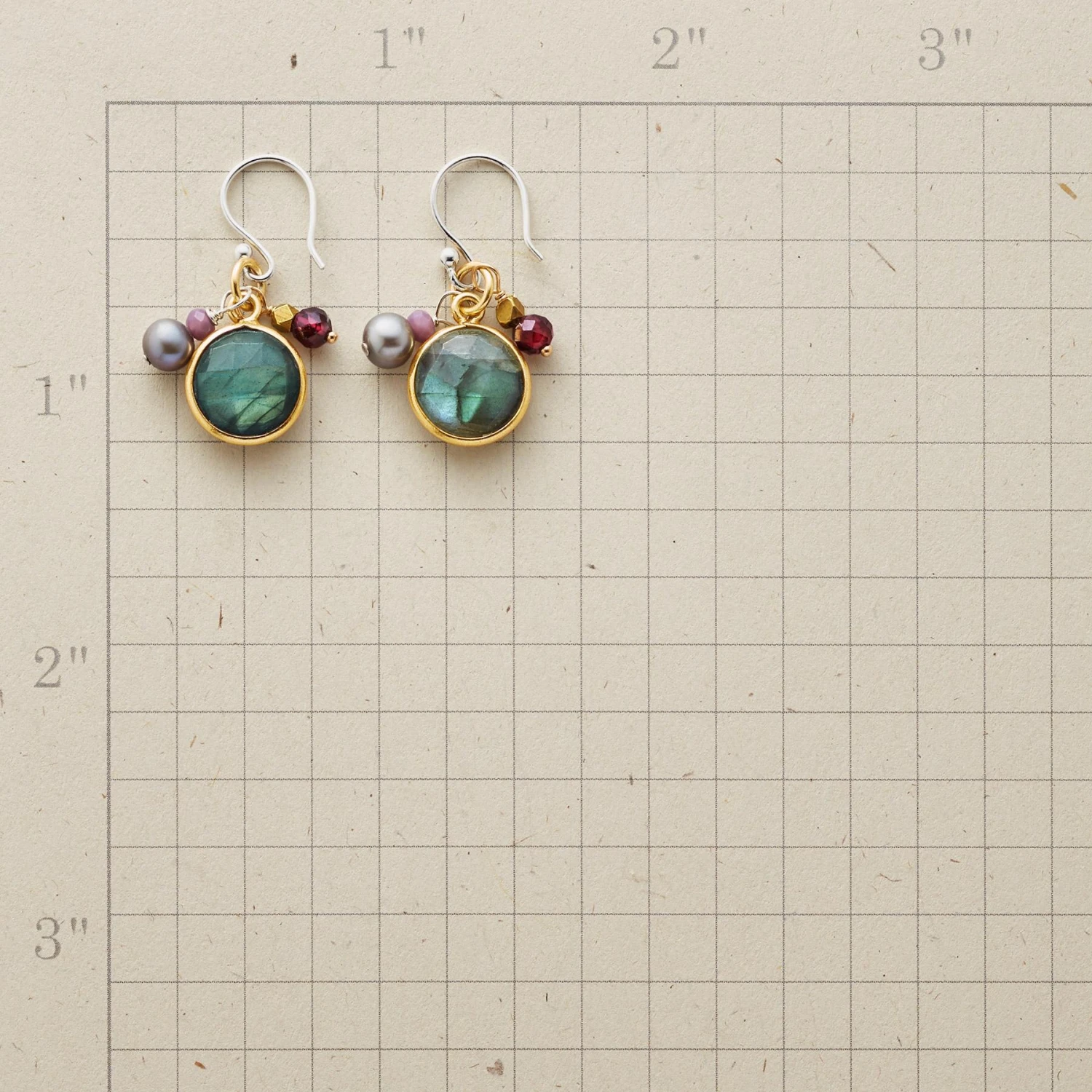 Labradorite circled in 18kt gold vermeil joins drops of garnet, lavender jade, and tinted freshwater pearl in lovely little danglers dancing on sterling silver wires. USA. Exclusive. 1″l.