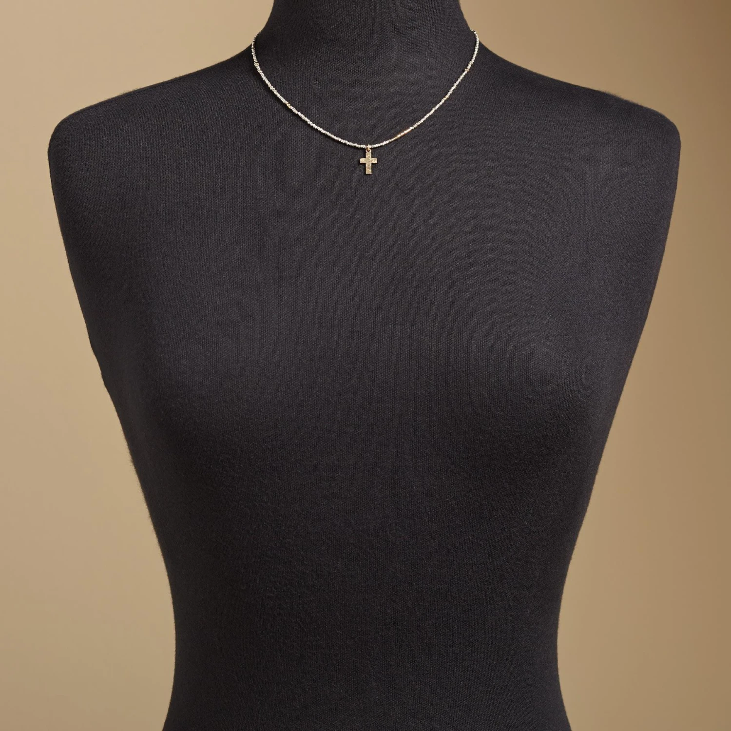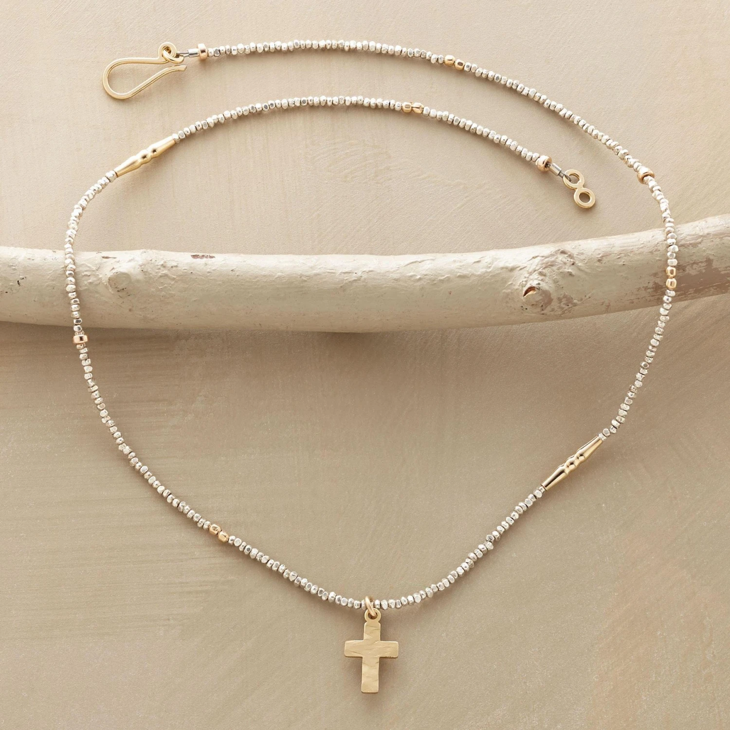 The carved look of our cross is a result of hand-hammering. Its 14kt goldfill is reflected in beads scattered among others of sterling silver. Hook clasp. Exclusive. Made in the USA. 17″L.