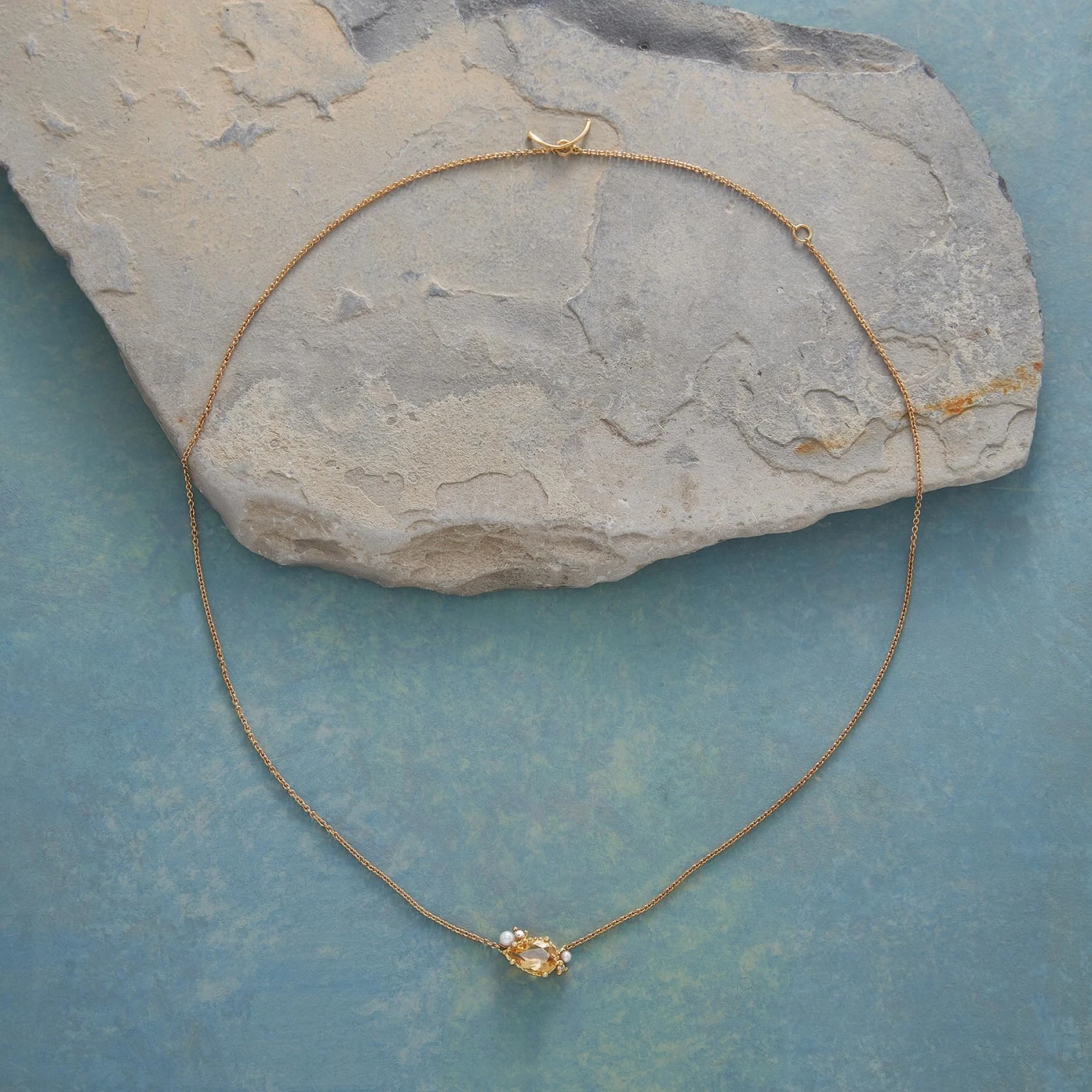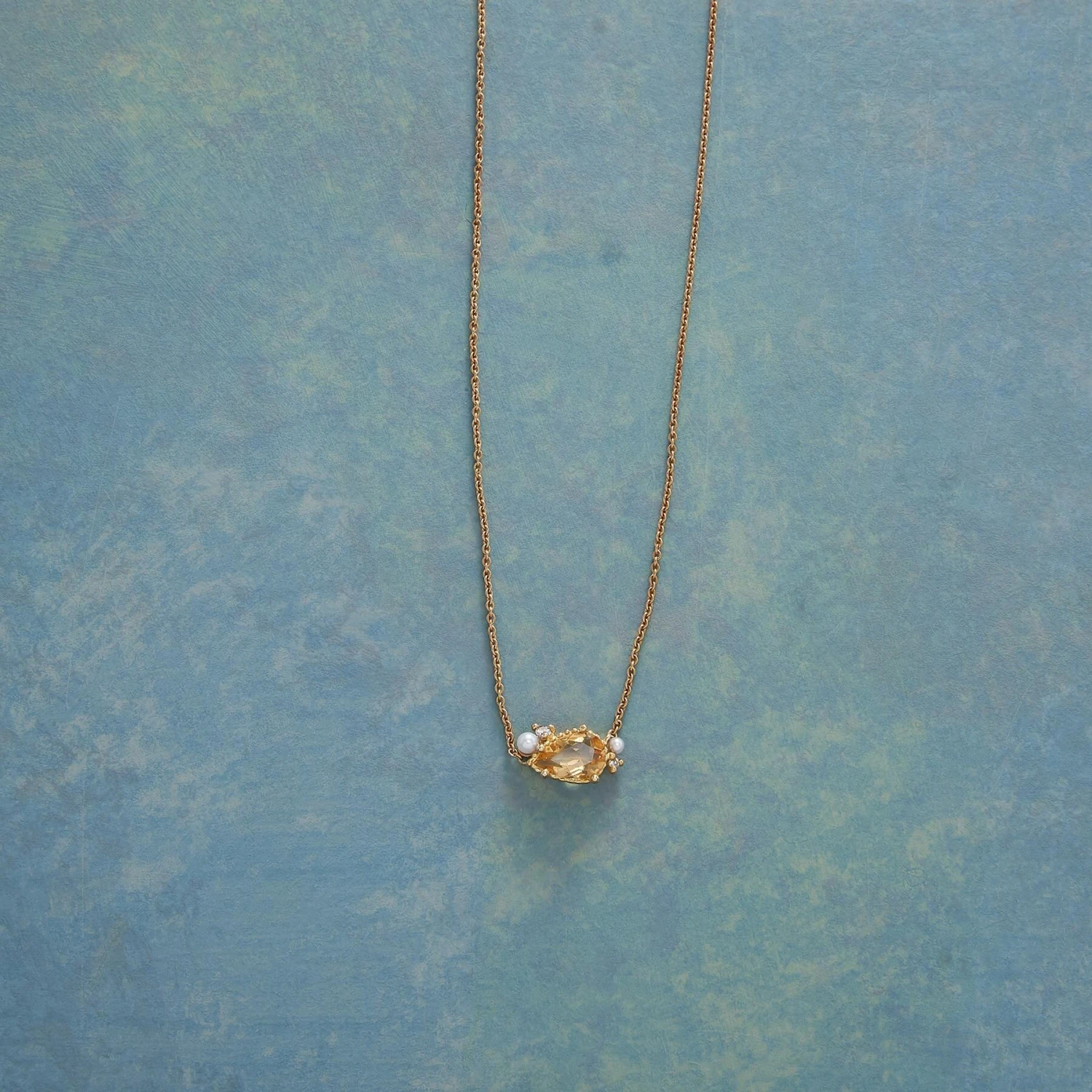 A pear-cut citrine sparkles like sunshine amidst the glow of freshwater pearl and the twinkle of gray diamond. 18kt yellow gold details, fine link chain and spring clasp. Handcrafted by Ruth Tomlinson. 16″ or 18″L.