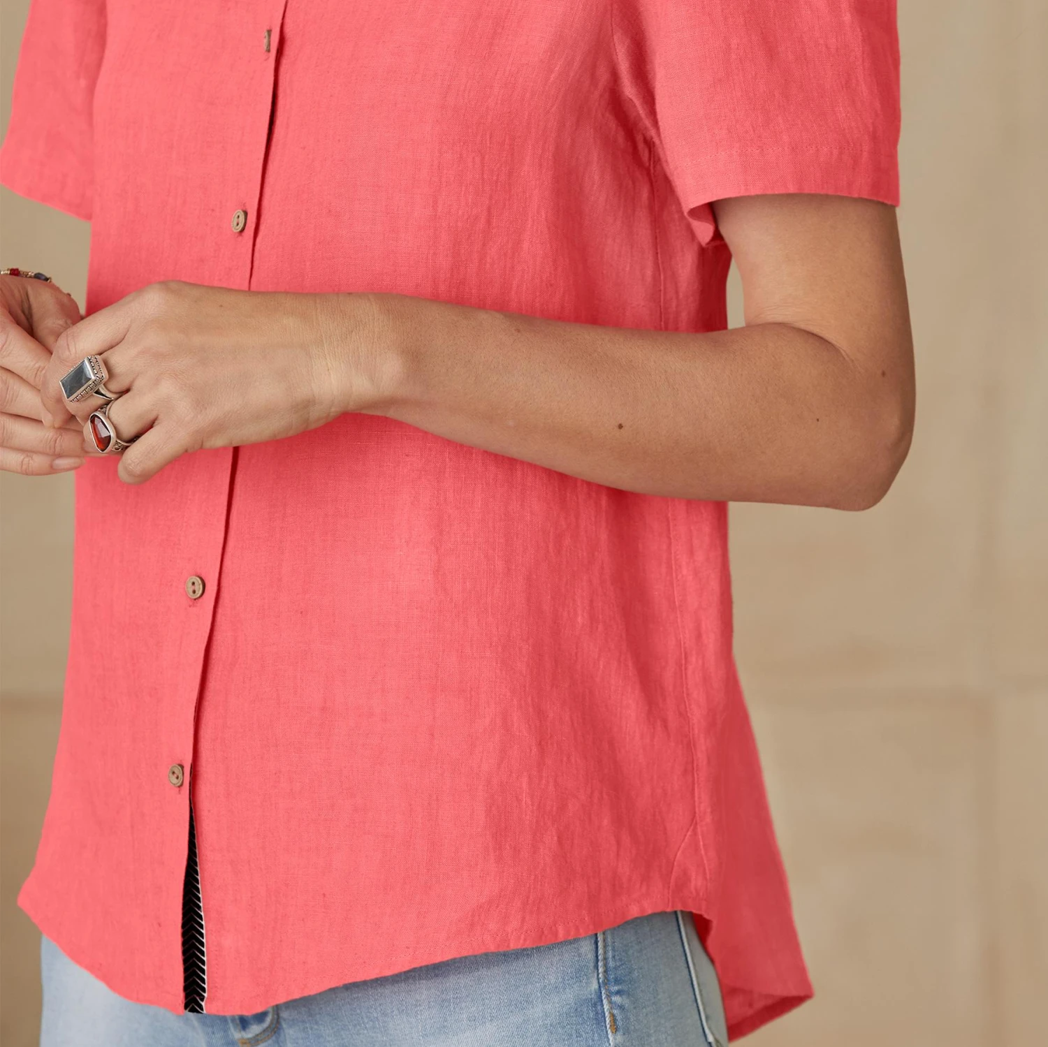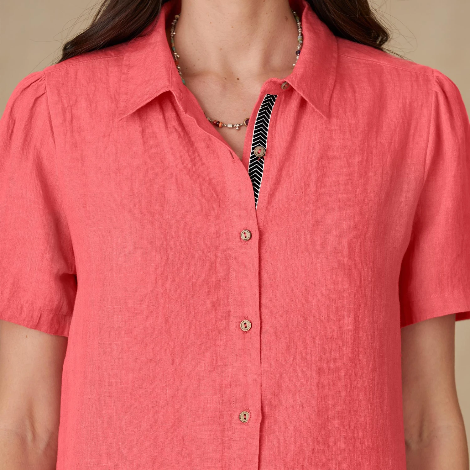 Camp-style shirt with coconut button front, shirttail hem, slight shirring at sleeves. Linen. Machine wash. Imported. Exclusive. Sizes XXS (00), XS (0 to 2), S (4 to 6), M (8 to 10), L (12 to 14), XL (16 to 18). Approx. 24″L.
