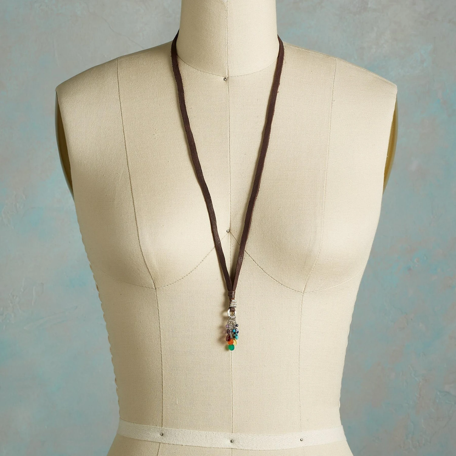Lapis, turquoise, amethyst, citrine, opal and more cascade from a hammered sterling silver ring, looped onto leather laces that adjust with a sterling slider. Handcrafted Exclusive. 28″L, 1-1/2″ drop.
