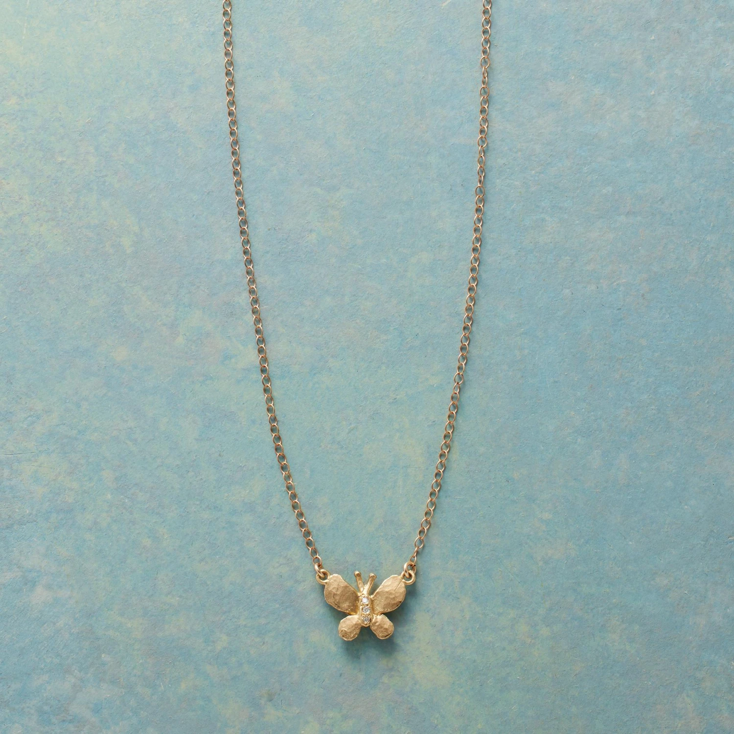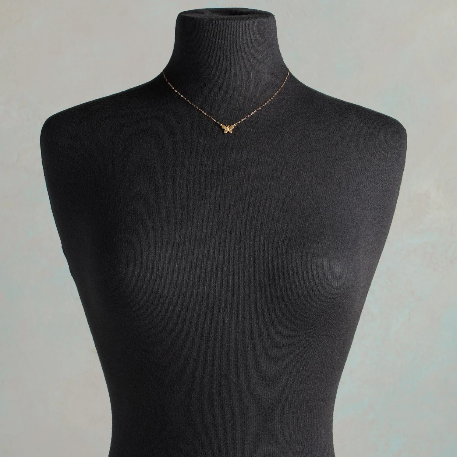 A butterfly, handcrafted and hammered to highlight its shimmering 14kt gold, is kissed with diamonds and flies on a dainty 14kt gold chain. Spring ring clasp. Made in the USA by Victoria Cunningham. 16″L.