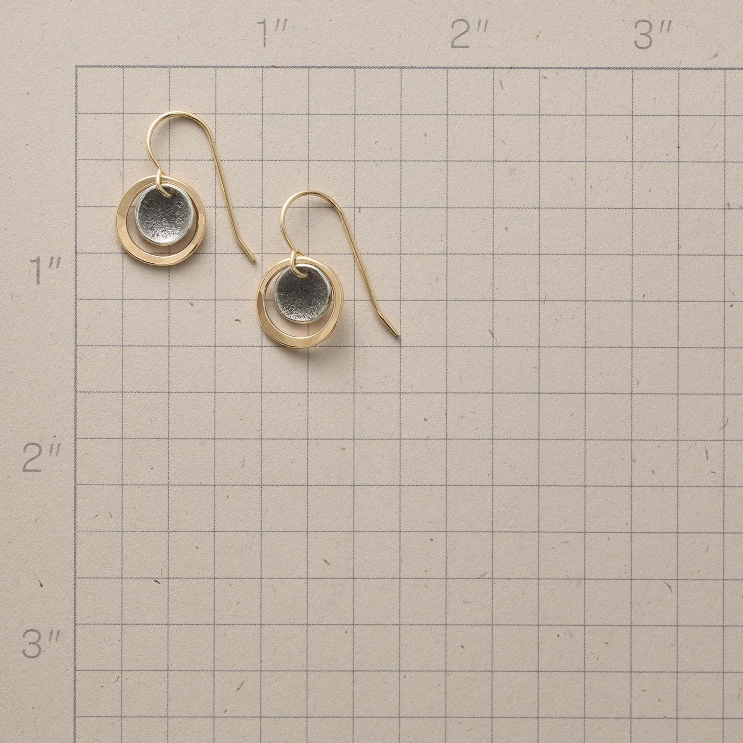 Diminutive cups of sterling silver rest within circles of 14kt gold filled, their tones and textures contrasting and complementing each other as they sway. 14kt gold-filled French wires. Handcrafted in USA. Exclusive. 3/4″L.