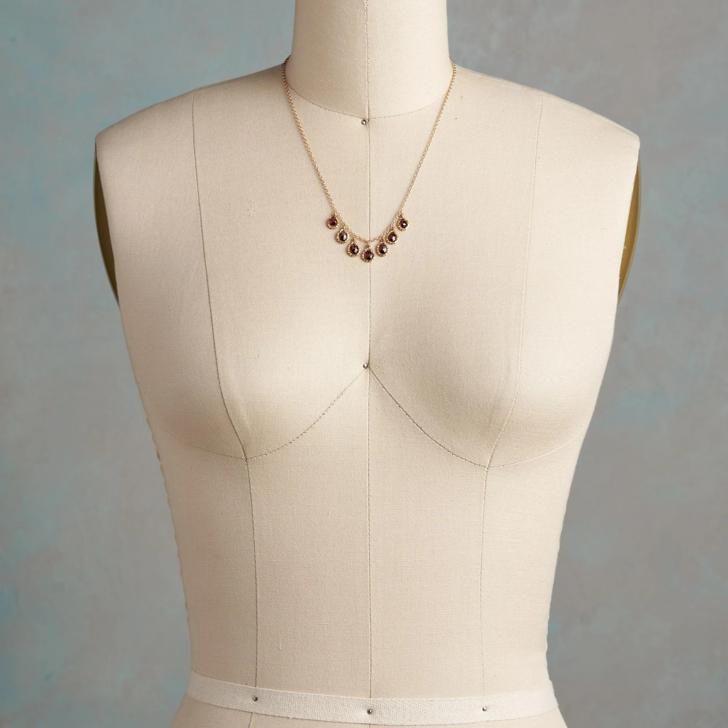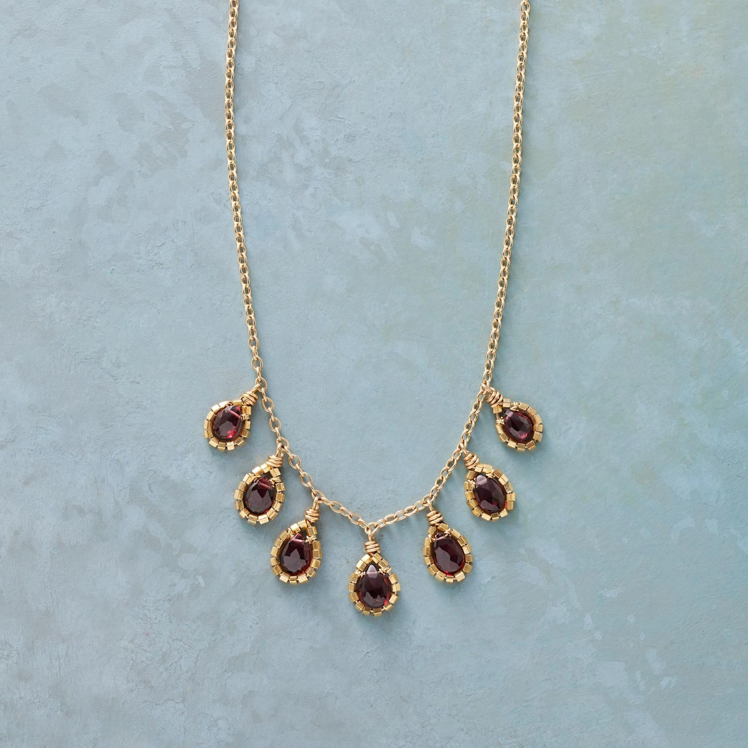 Dana Kellin’s garnet teardrops form a garland for the wearing. Each translucent red gem is outlined in hexagonal beads. Handmade in USA. 14kt gold filled. Lobster clasp. 18″L.