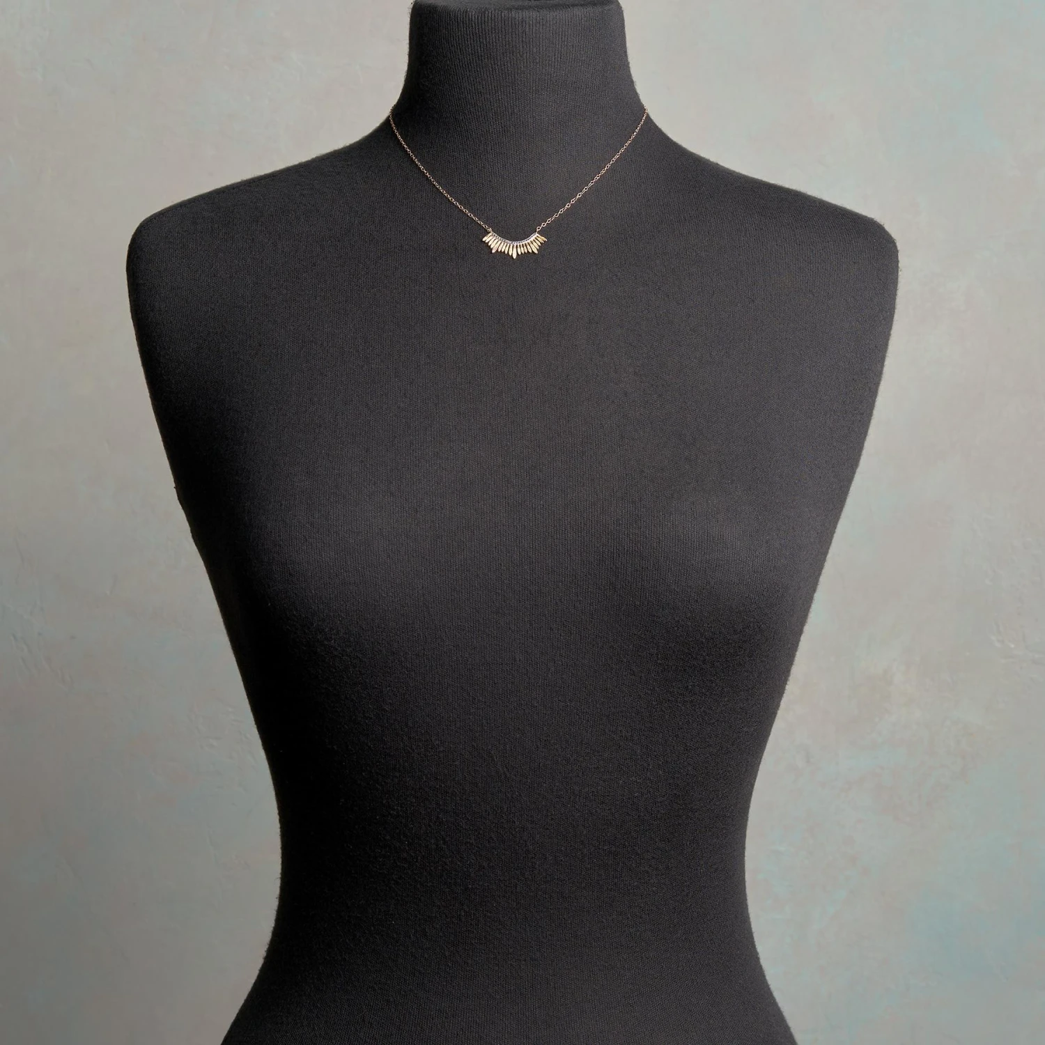 A necklace of rare and bold beauty handmade with a 14kt gold chain on which a collar pendant is fringed with 24kt gold feathers and topped with blue sapphires. 14kt gold lobster clasp. Made in the USA by Nichole McIver. 16″L.