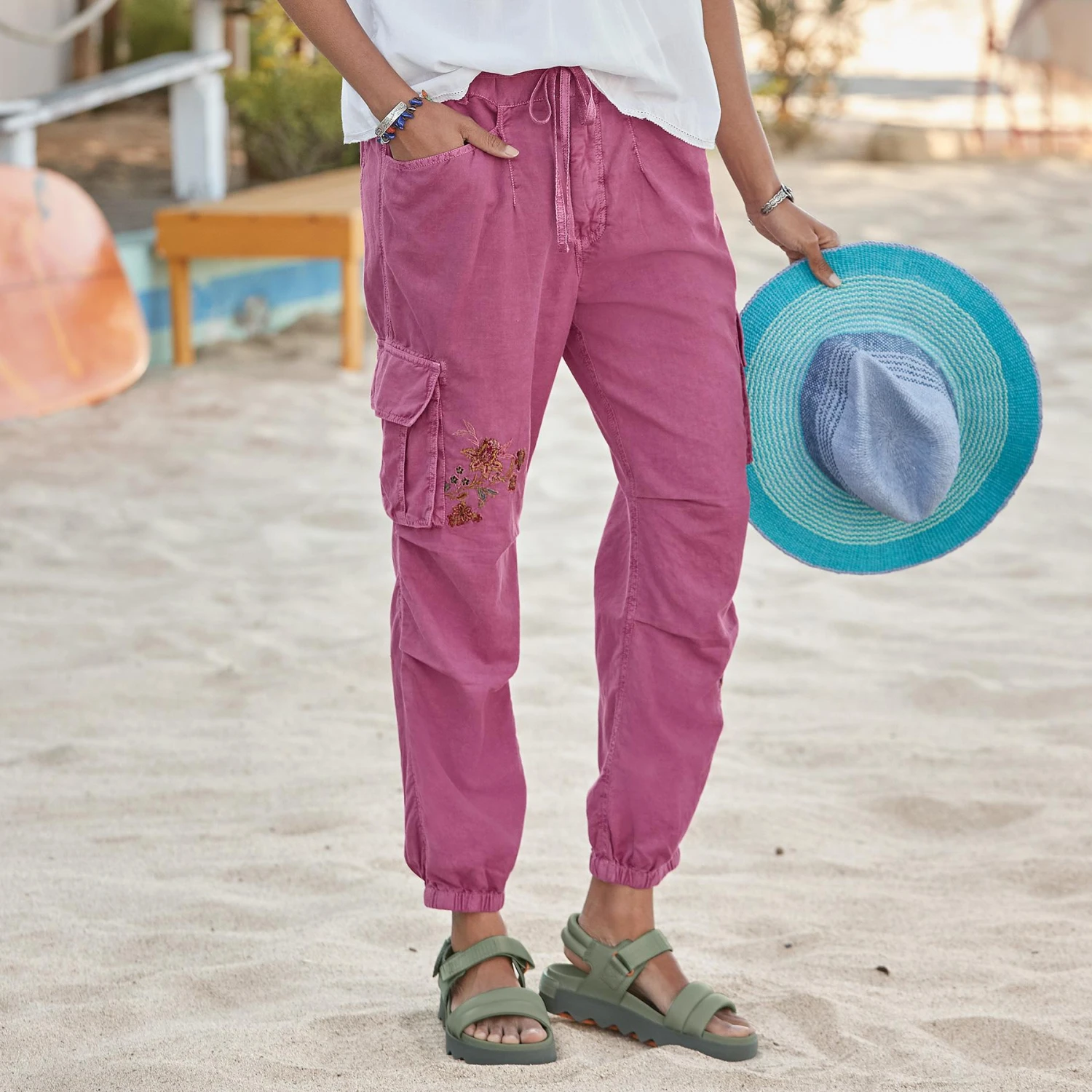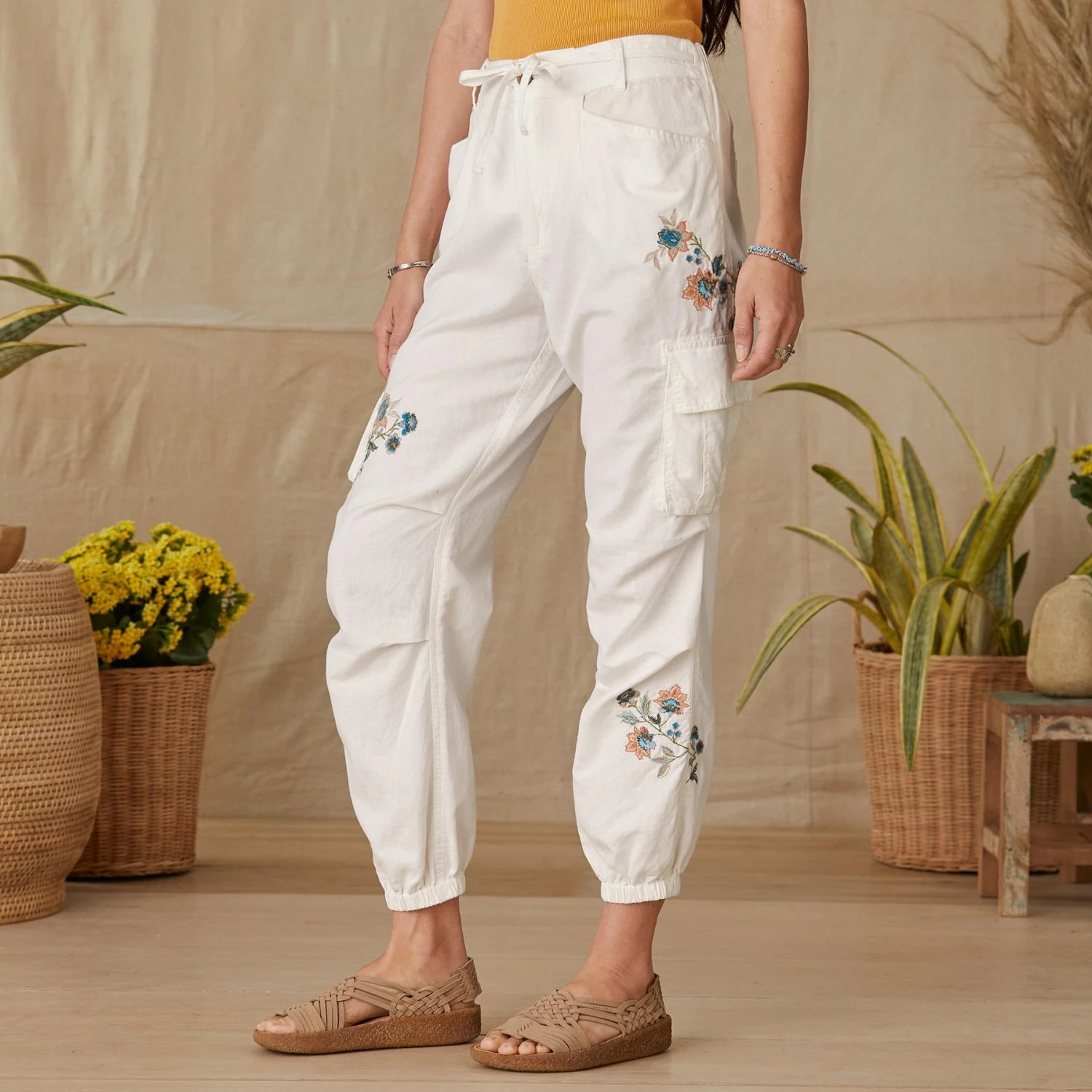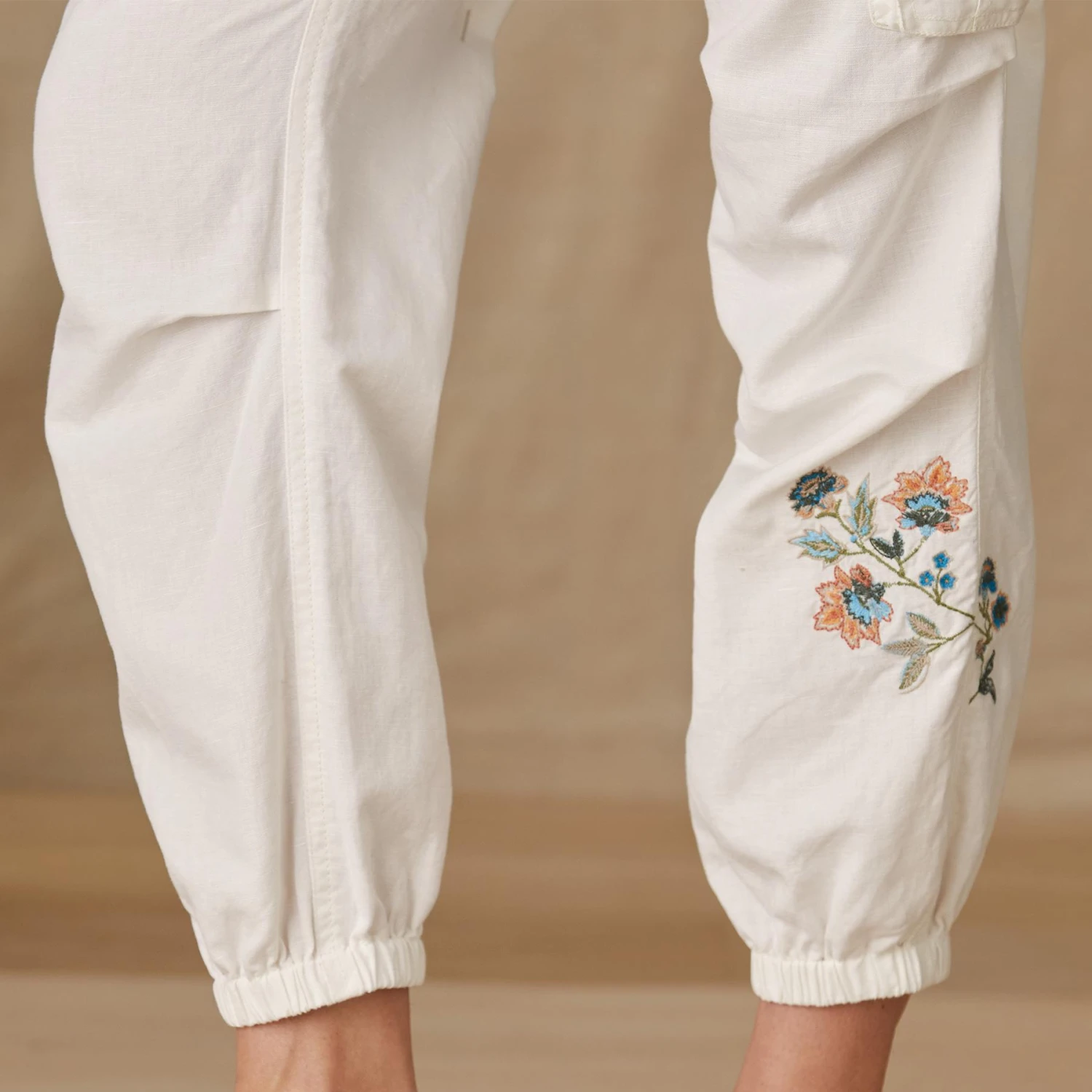 Vintage-inspired embroidery graces our soft, garment-dyed joggers with elastic cuffs and waist, cargo pockets and zip/button fly. Linen/cotton. Machine wash. Imported. Exclusive. Sizes 0 to 14. 24″ inseam.