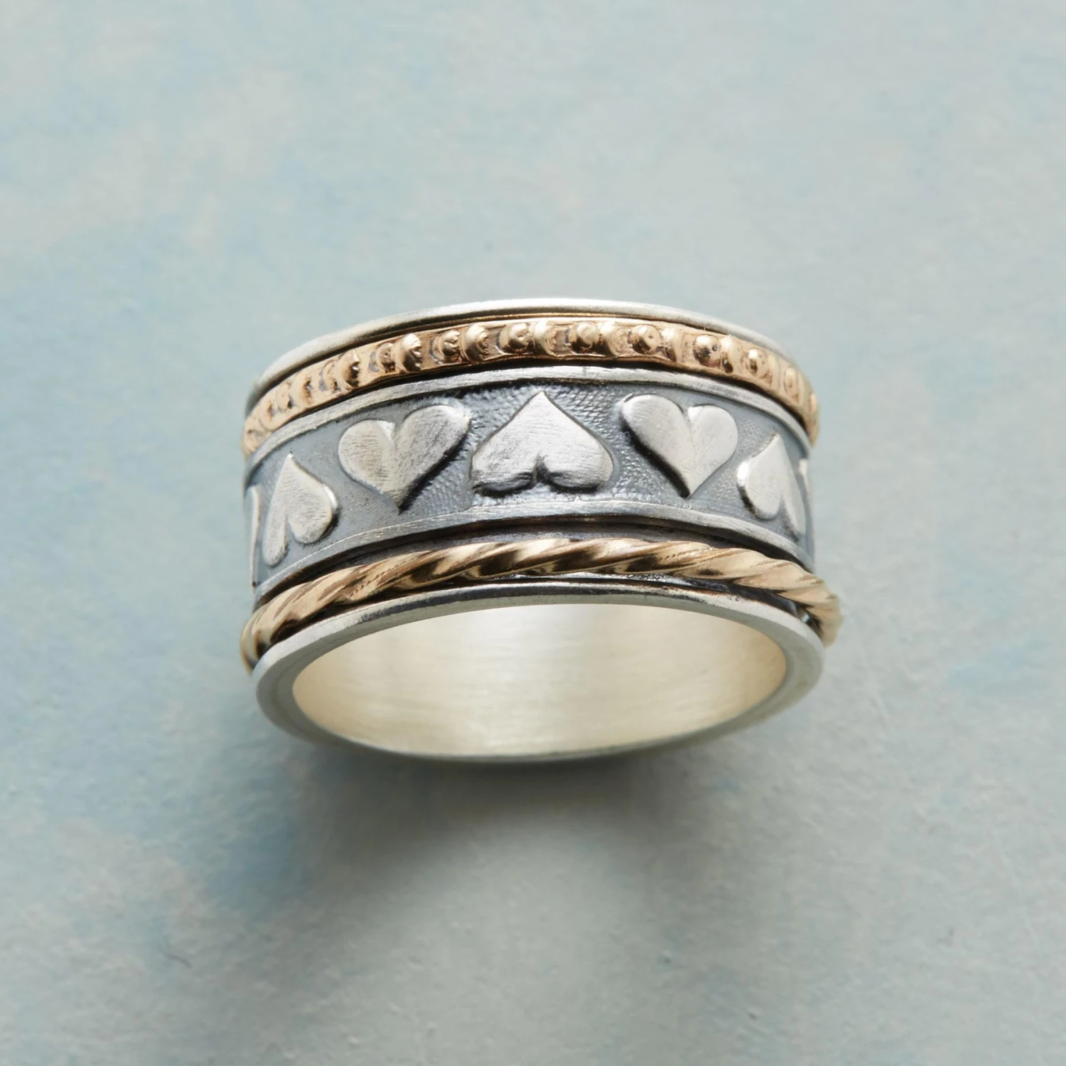 Our spinner ring boasts a band of hearts cast in sterling silver, revolving between two different 12kt gold-filled bands on a sterling base. Handcrafted exclusive. Whole sizes 5 to 9. Approx. 1/2″W. This ring is licensed under U.S. patent nos. 6,497,117 and 6,295,732.