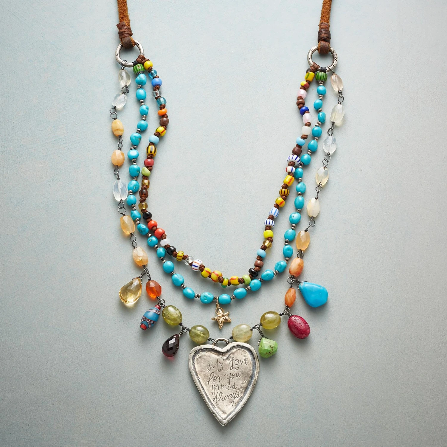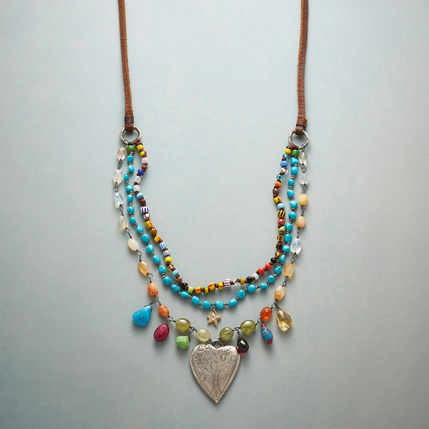 A wise old owl peers out from the tree etched into Jes MaHarry’s sterling silver heart. With turquoise, citrine, trade beads and more. Slider adjusts length to 32″L; 1-3/8″ heart. Exclusive. Handmade in USA.
