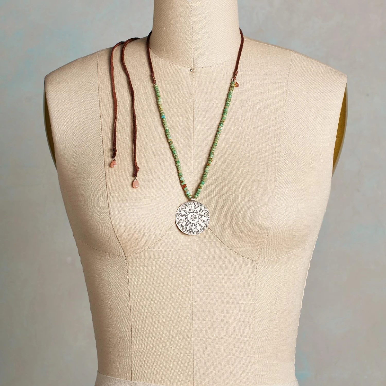 Orange garnet sparks amid cool blue turquoise anchored by a sterling silver mandala. Leather laces with a Hill Tribe silver slider let you wear this piece long or short. Handmade in USA. Exclusive. 12″-50″l, 1-1/2″ drop.