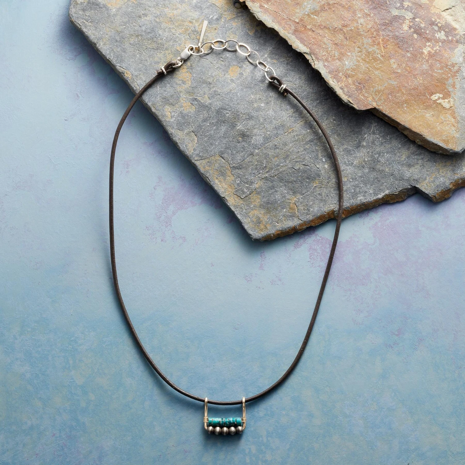 Turquoise heishi beads align atop brushed oxidized sterling silver spheres, Dark brown leather with a 14kt gold-filled harness. Exclusive. Handcrafted in USA. Sterling silver lobster clasp. 16″ to 17″L.