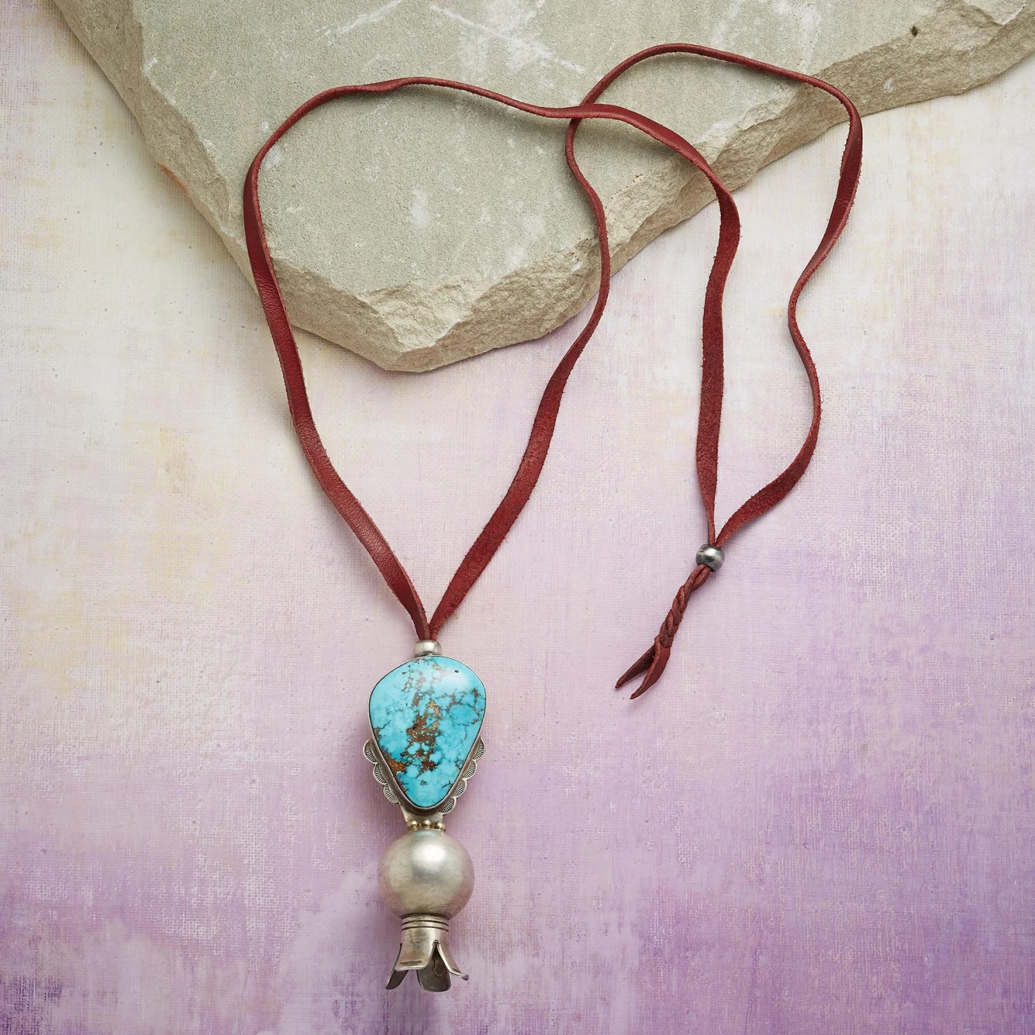 The artist Jesse Robbins focuses on one of the most iconic of Native American jewelry symbols — the squash blossom, handcrafting it in sterling silver and crowning it with a stunning turquoise from Nevada’s Cheyenne Mine framed in hand-cut, scalloped sterling. Leather cord; sterling silver slider beads. Made in USA. One of a kind. 32″L; 3-5/8″L x 1-1/4″W pendant blossom.