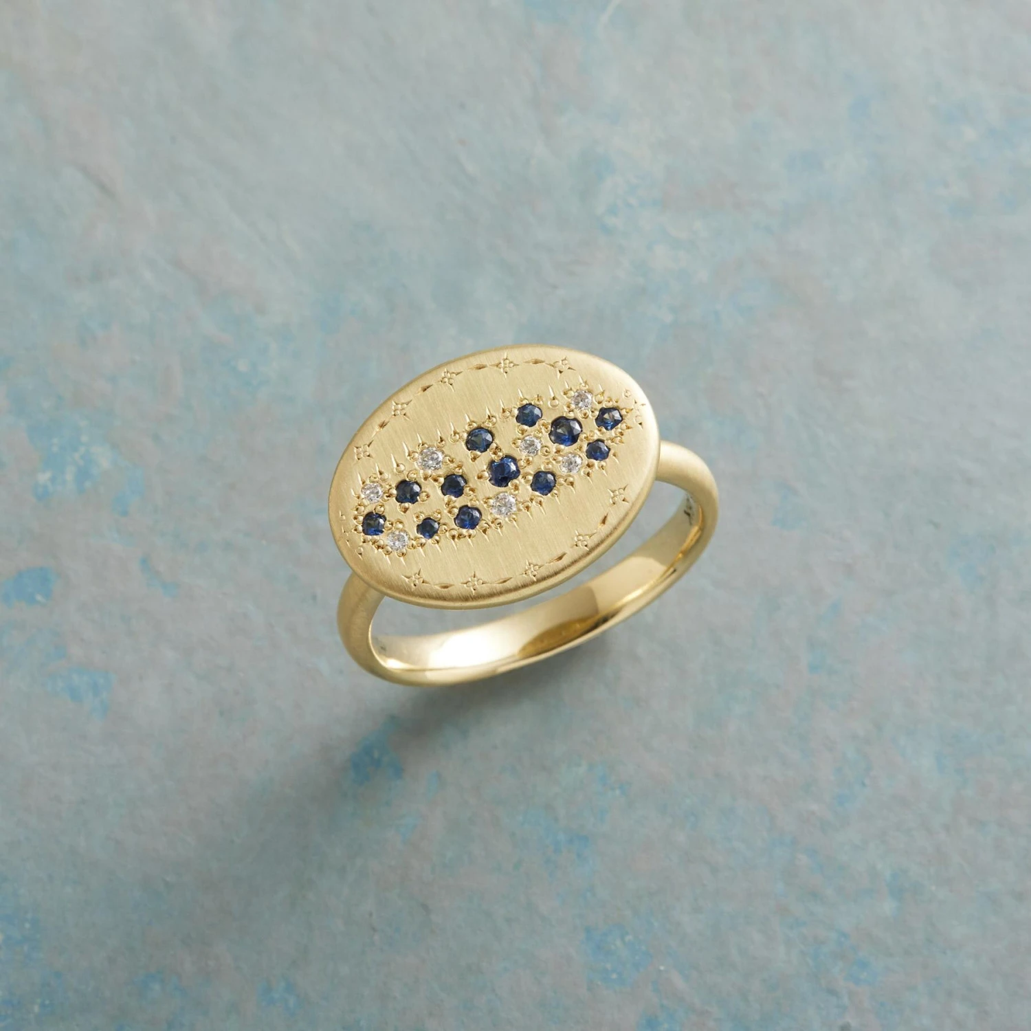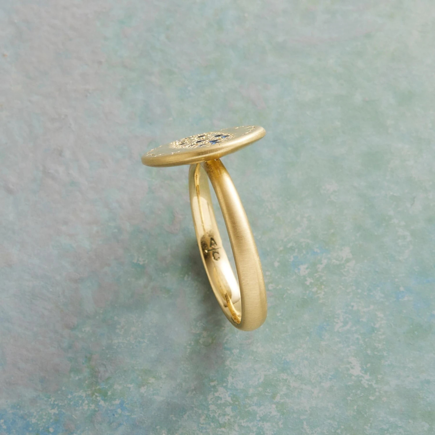Adel Chefridi fashions a sapphire and diamond lagoon among delicate etchings that are a signature of his creations. Satin-finished 18kt gold. Handmade in USA. Whole sizes 5-9.