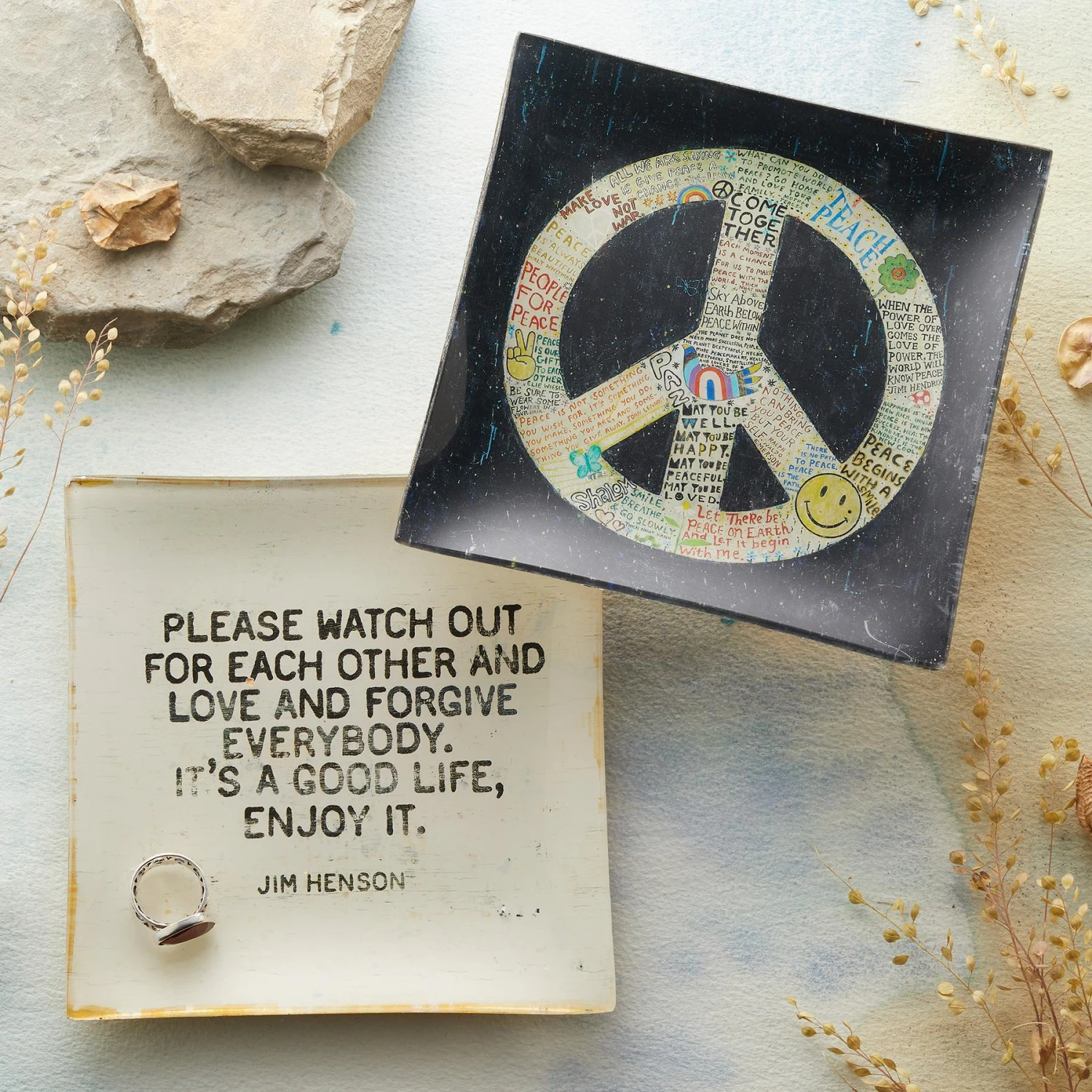 Emblazoned on this handcrafted glass dish, wise words from puppeteer Jim Henson are a timely reminder to enjoy life and take care of each other. Backed with hand-painted gold leaf. Imported. 5-3/4″sq.