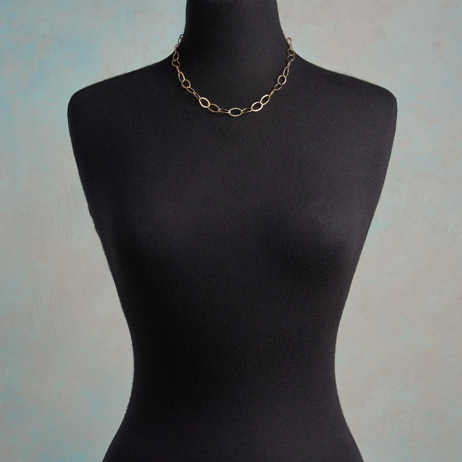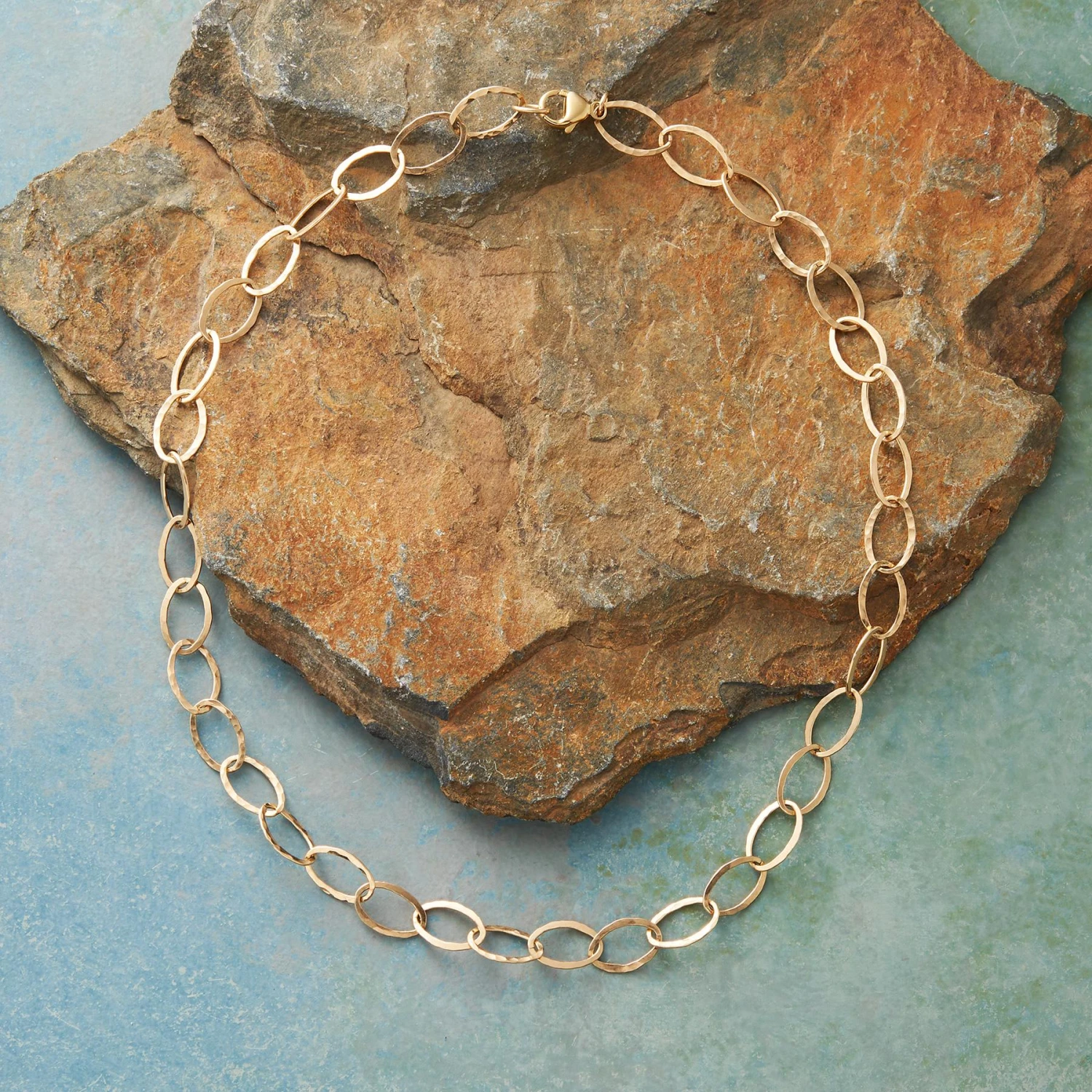 Polished links, smooth on one side, hammered on the other, shift this way and that to light-catching effect. 14kt gold filled. Lobster clasp. Exclusive. Handcrafted in USA. 18″L; 3/8″W.
