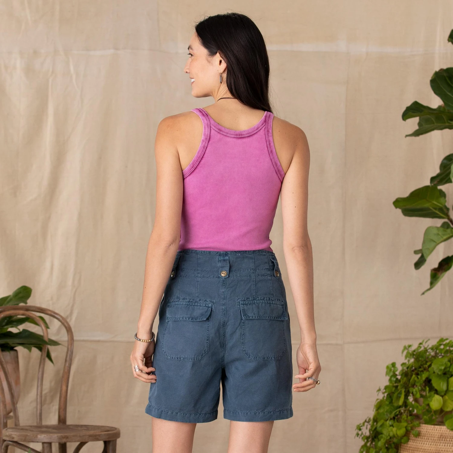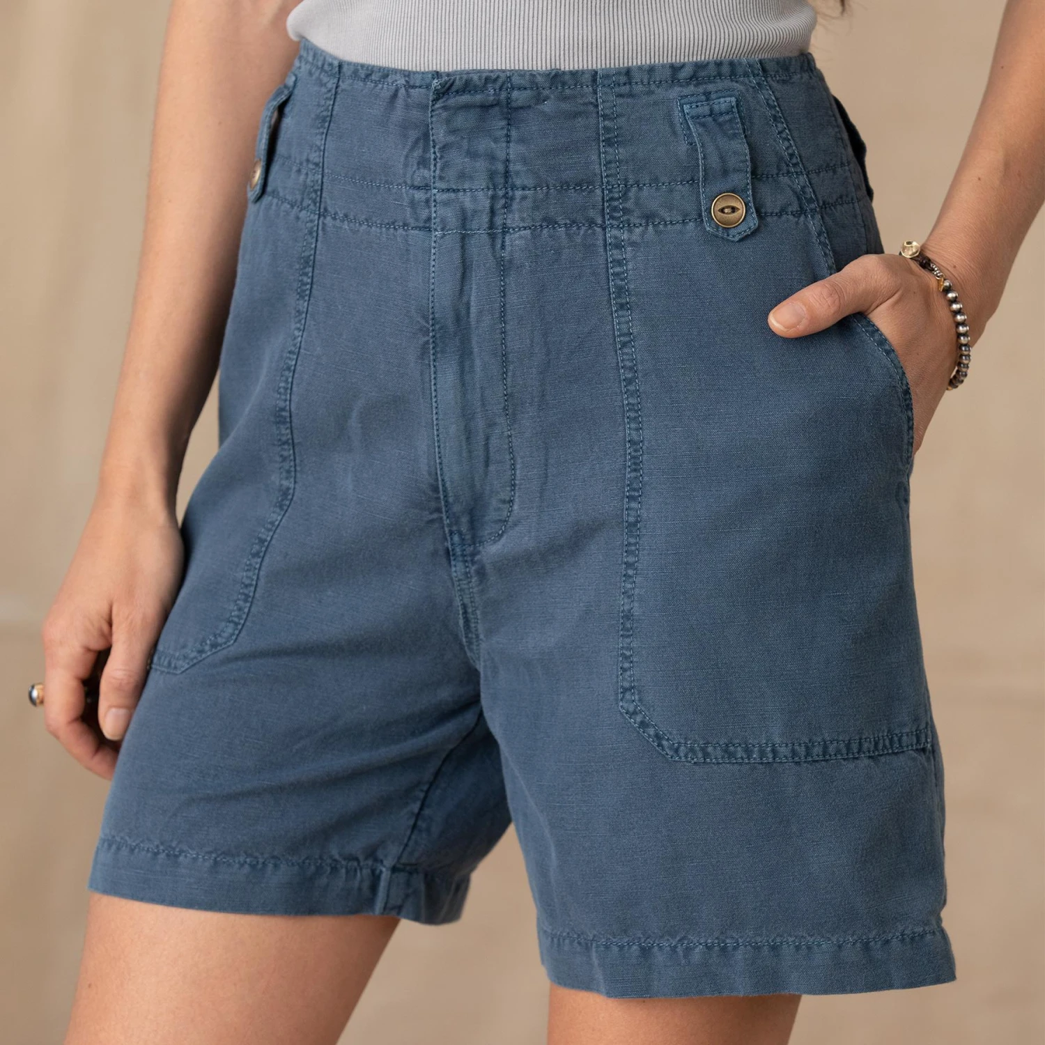 Classic, everyday shorts, with zip and fish eye metal button fly, four pockets, novelty lining. Linen/cotton. Machine wash. Imported. Exclusive. Sizes 0 to 14. 4-3/4″ inseam.