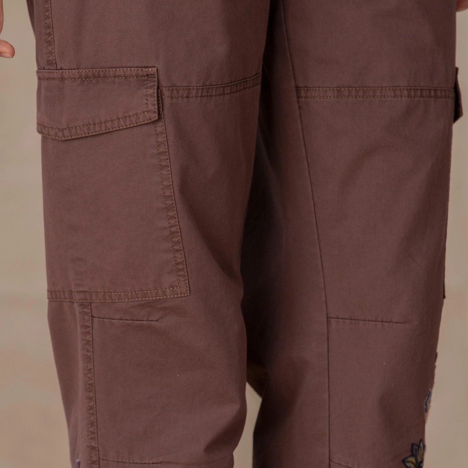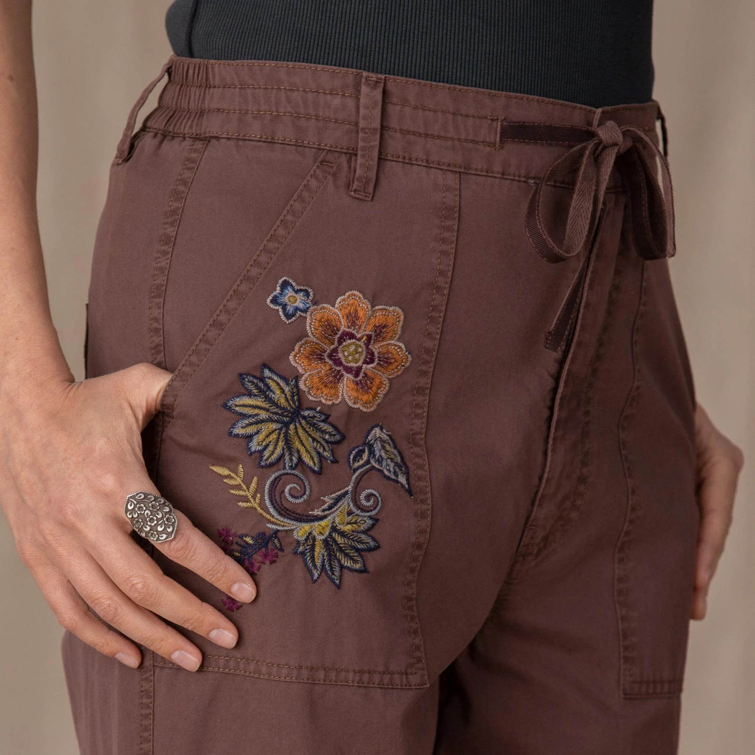 Vintage floral and butterfly embroidery graces our slim cargo pants. Button fly closure with functional draw cord at the waist, knee darts and novelty belt loops. Cotton. Machine wash. Imported. Exclusive. Sizes 0 to 14. 26″L.