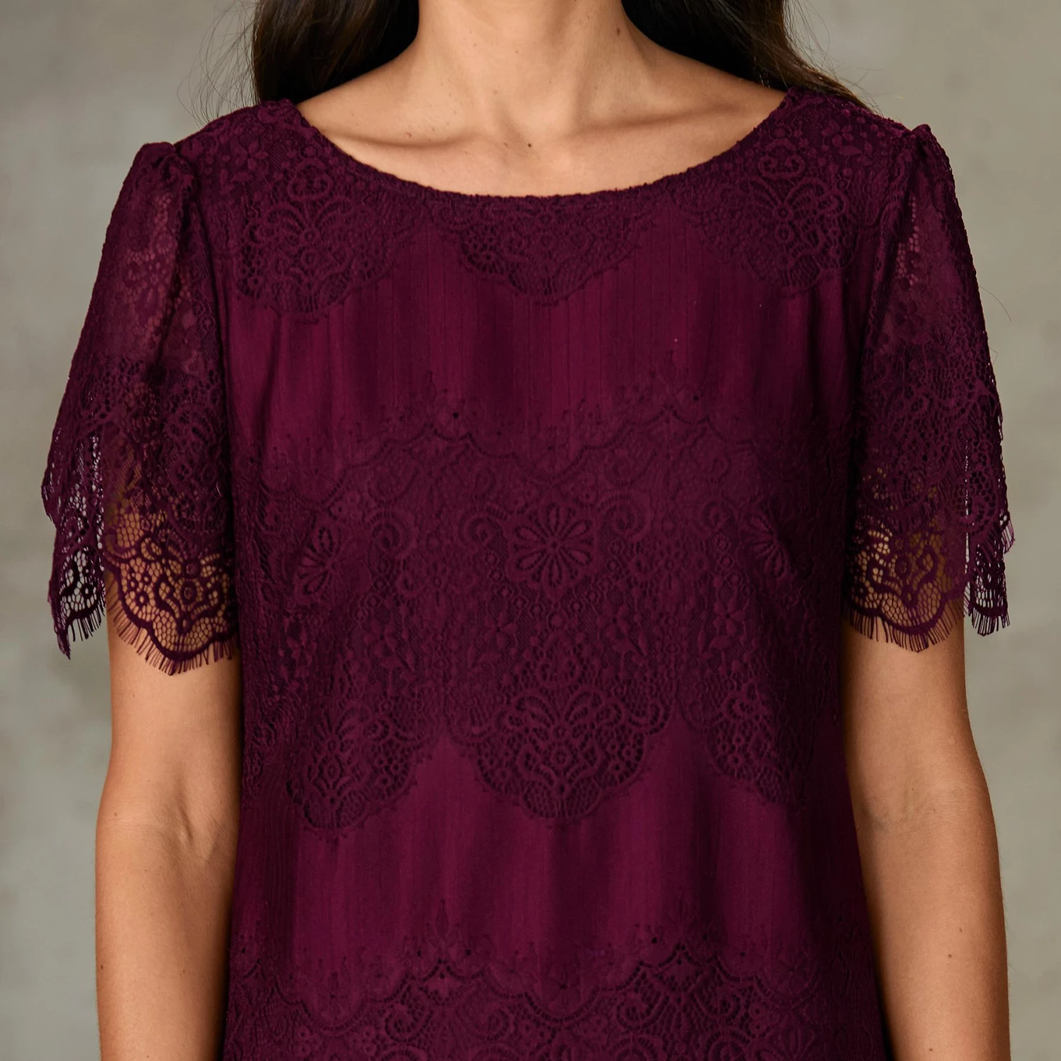 Embroidered lace shift dress with alluring deep back V with zipper, scalloped sleeves and hem. Fully lined. Nylon. Hand wash. Imported. Exclusive. Sizes XS (0 to 2), S (4 to 6), M (8 to 10), L (12 to 14), XL (16 to 18), XXL (20 to 22). Approx. 38″L.