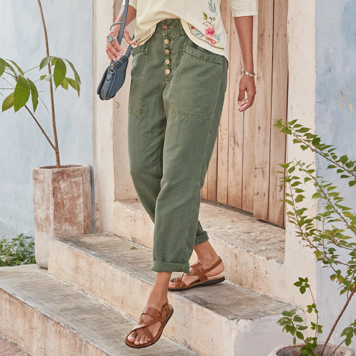 Easy, button fly pants with elastic back. Ladder lace detail. Linen/cotton. Machine wash. Imported. Exclusive. Sizes 0 to 14. 26″ inseam.