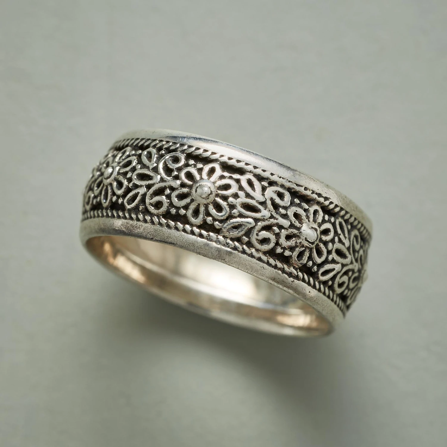 Bas-relief flowers and foliage flourishes encircle the finger, set against an oxidized backdrop that accentuates each blossom. Exclusive. Handcrafted in whole and half sizes 5 to 9.