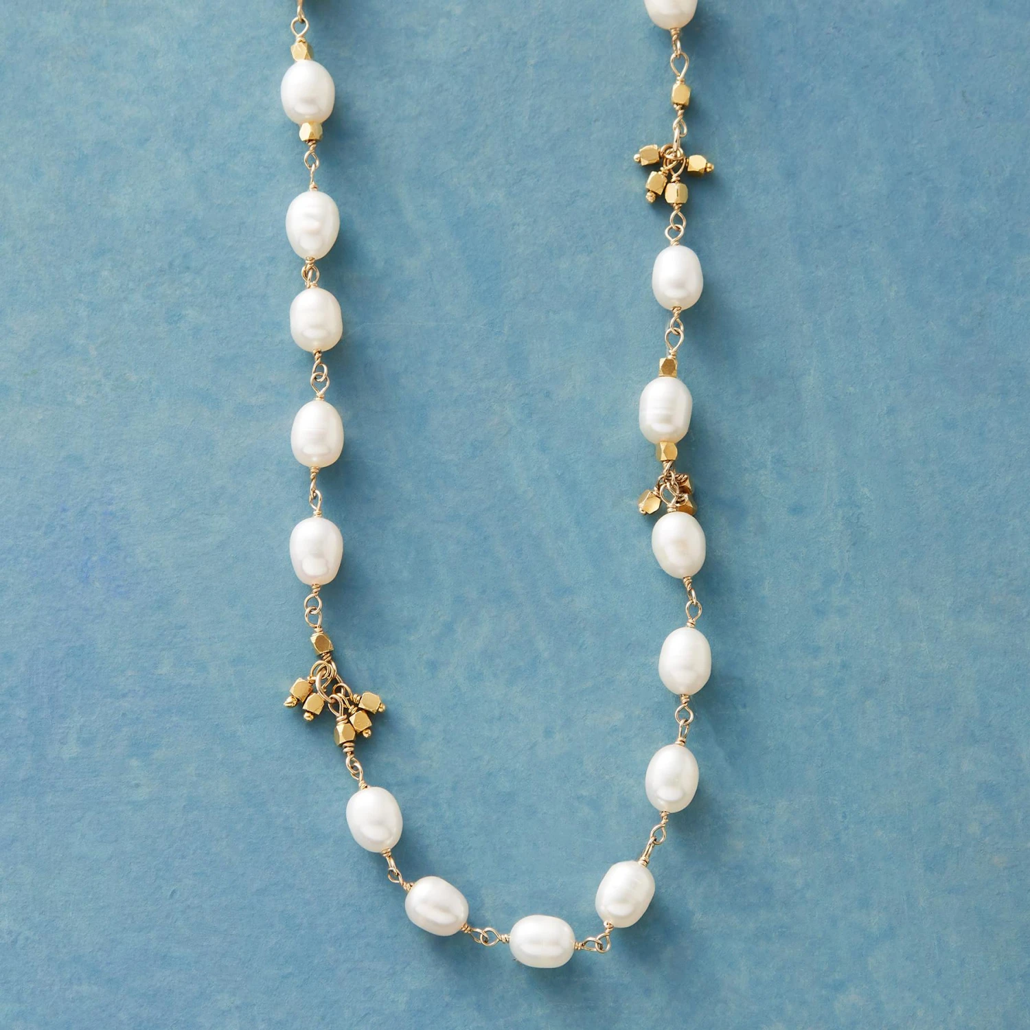 Cultured freshwater pearl tiptoes round the neck, accompanied by dangling trios of 18kt gold vermeil beads. Exclusive. Handcrafted with 14kt gold filled links and lobster clasps. 16″ to 18″L.