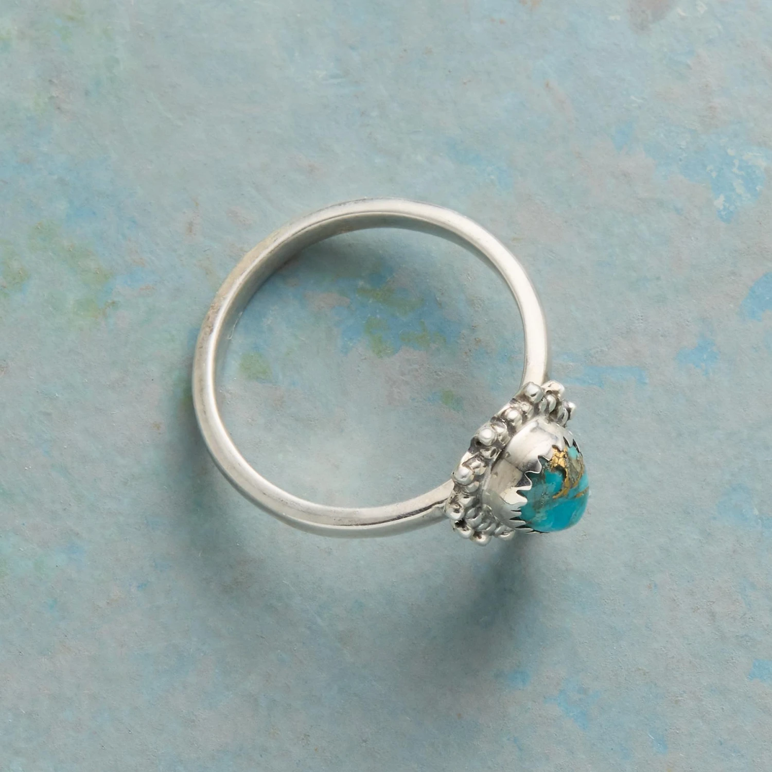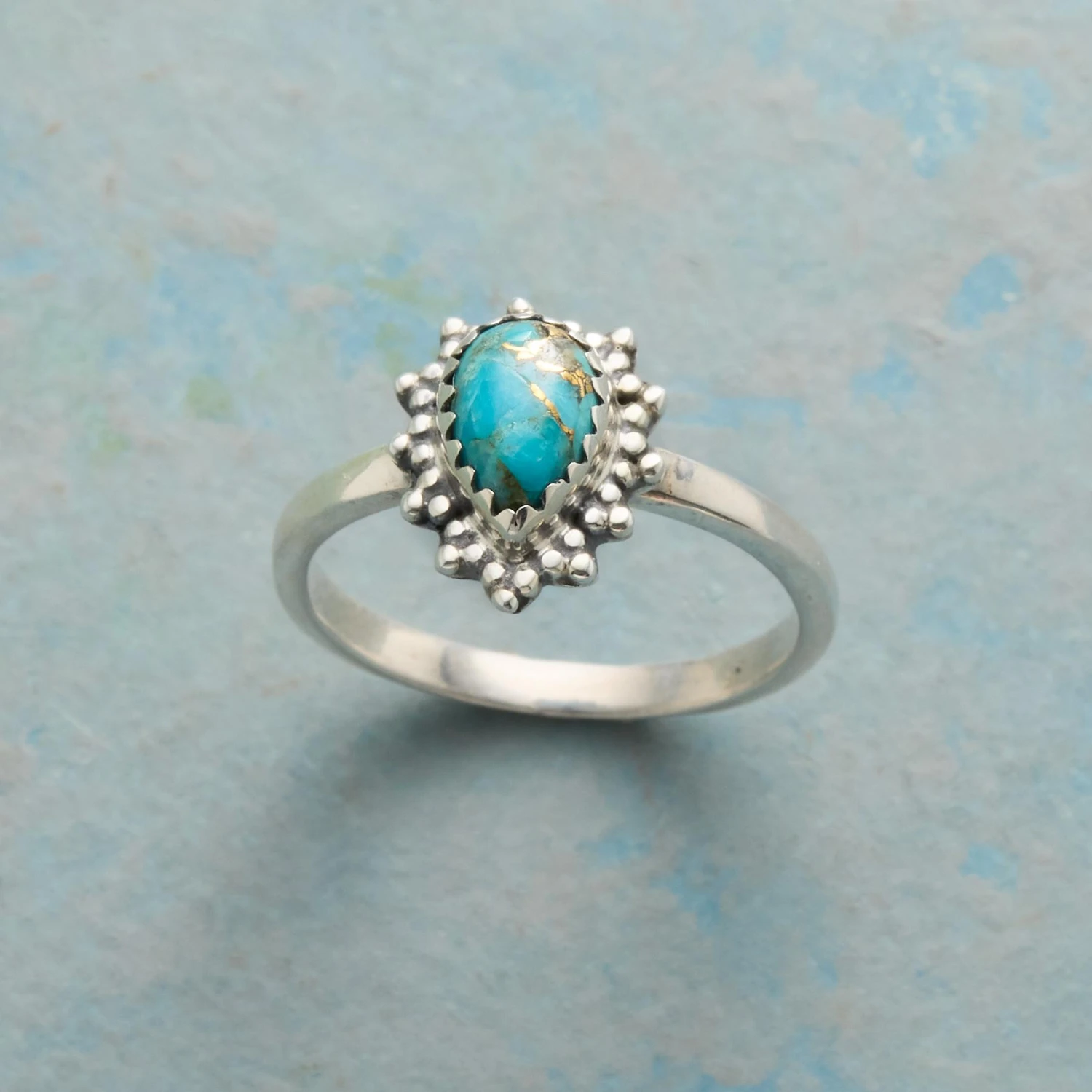 Petite and feminine, our ring edges a teardrop of copper turquoise with a beaded frill of sterling silver for standout style. Handcrafted. Exclusive. Whole sizes 5 to 10. 1/2″W.