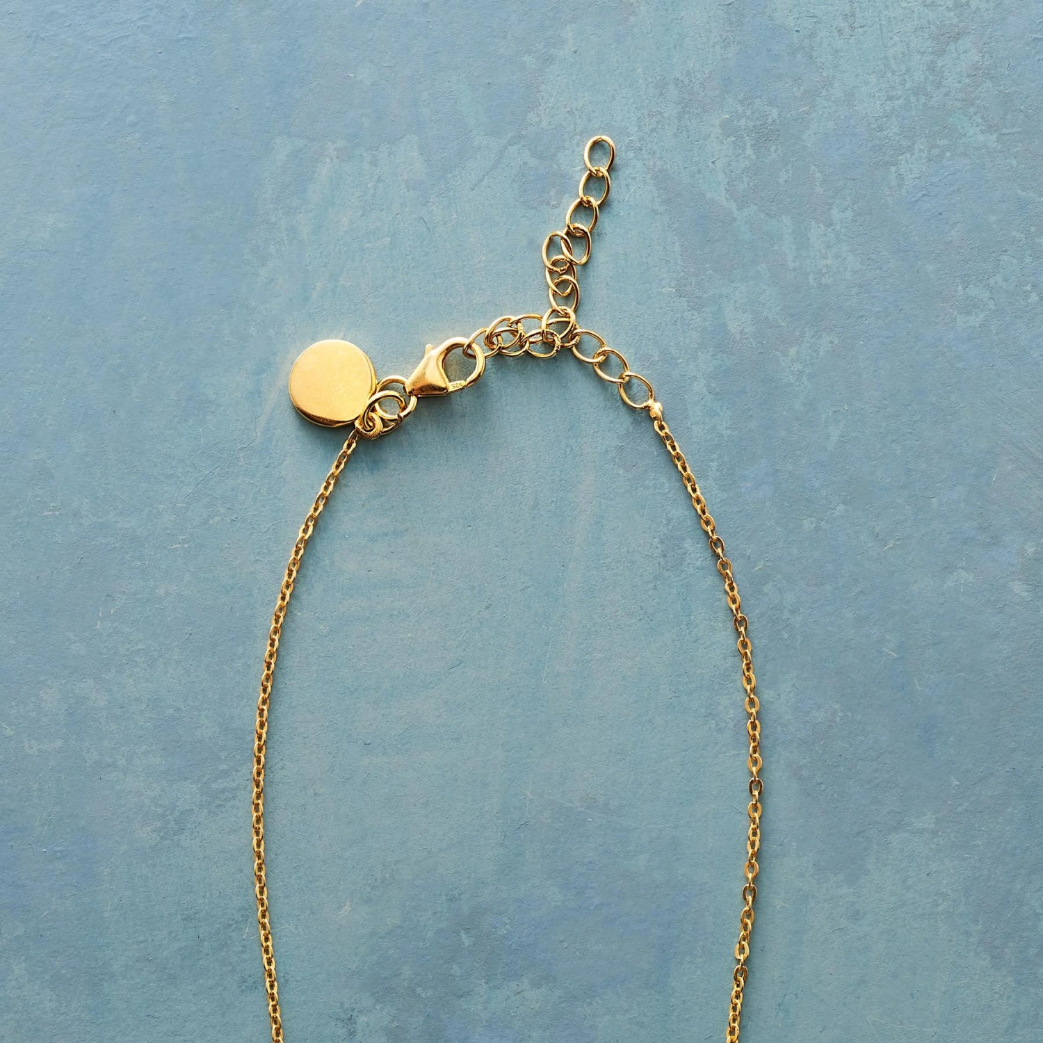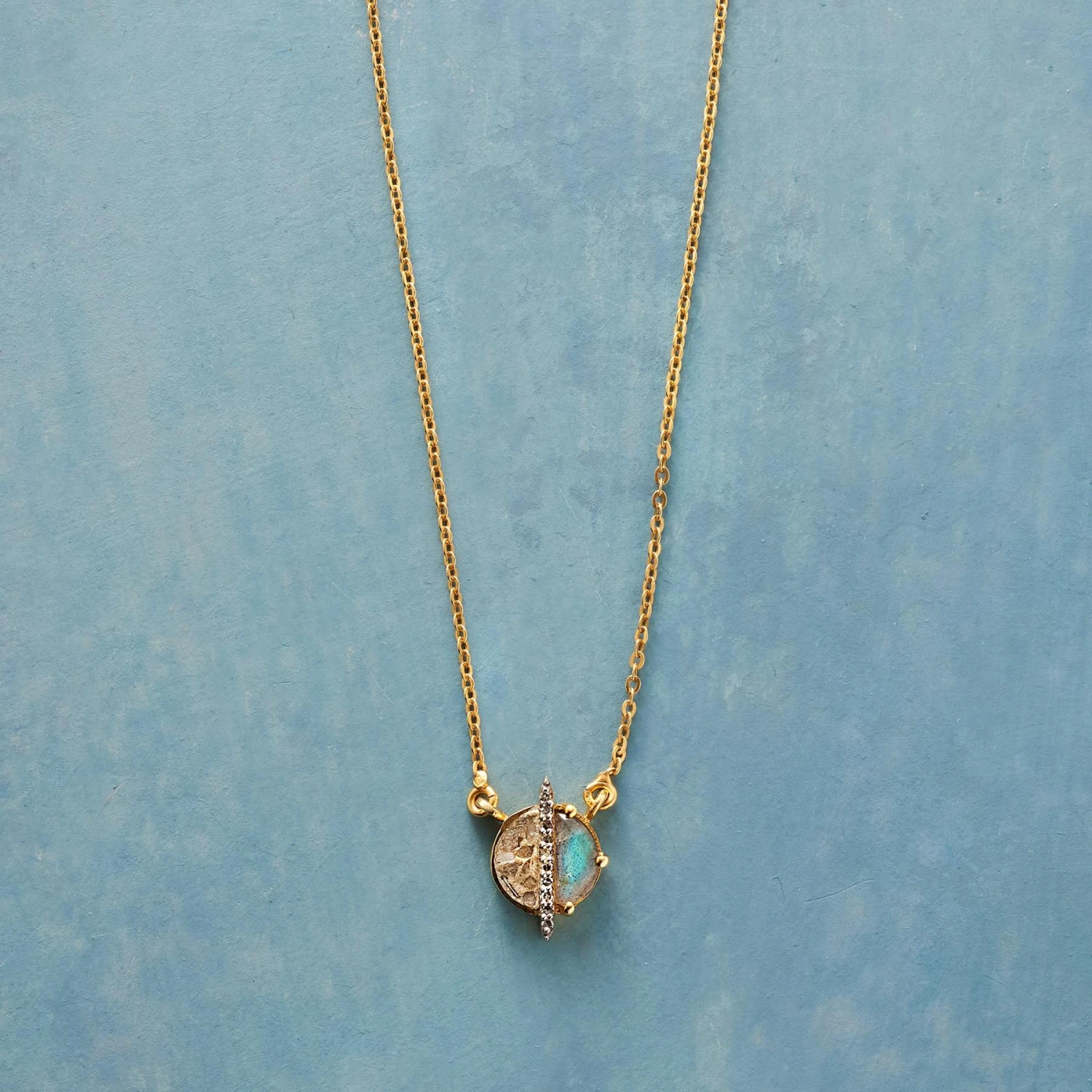 Between two equally promising visions of the future, a champagne diamond bar bisects labradorite and raw uncut diamond pavé. Handcrafted in 18kt gold vermeil. Lobster clasp. 15″ to 17″L.