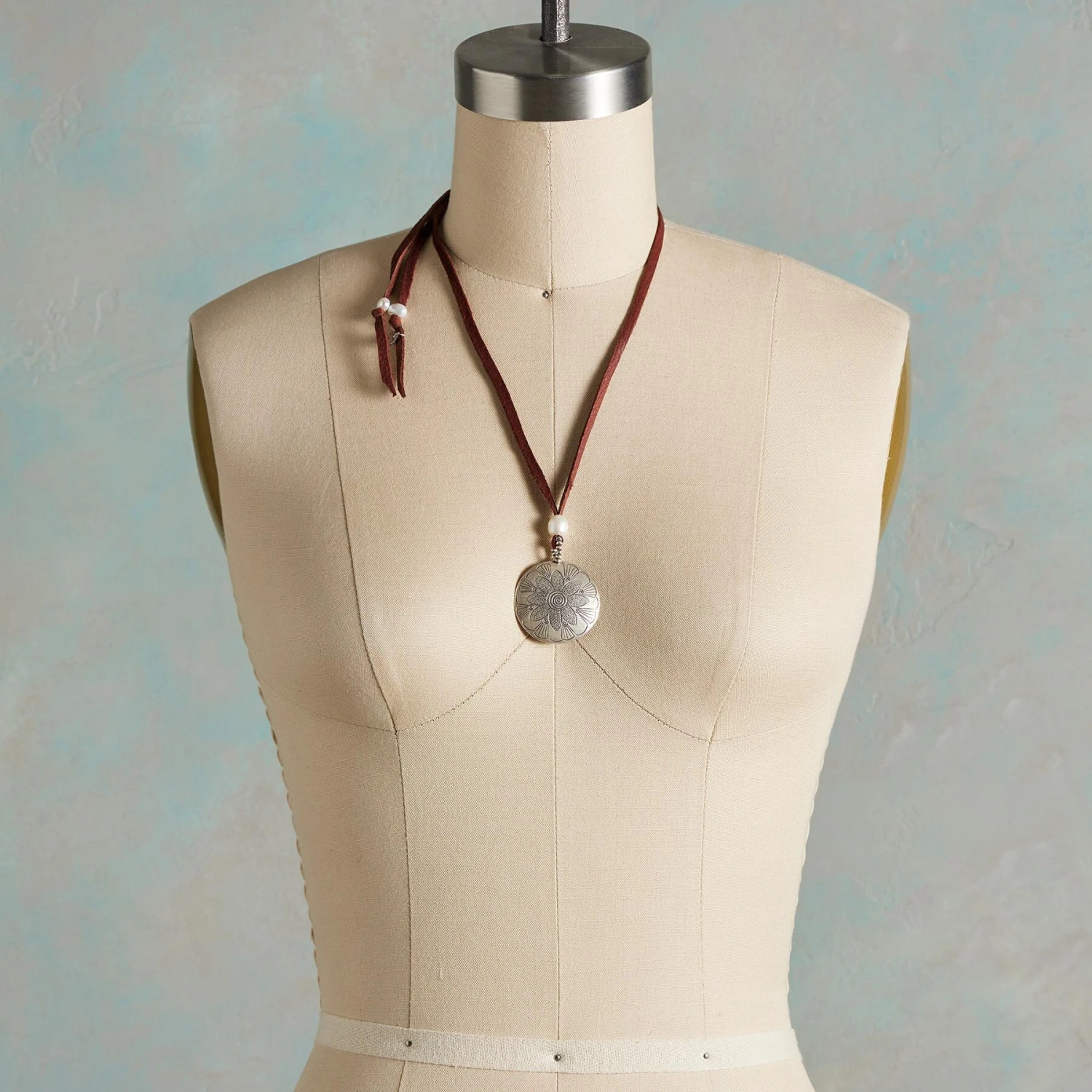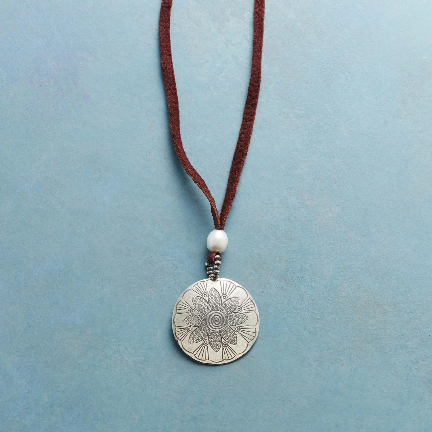 A spiral-centered flower blooms on our medallion, hand-stamped on softly domed Thai silver beneath a shimmering cultured freshwater pearl. Two more pearls trim the soft leather laces, which adjust with a Thai silver slider. Handcrafted. Exclusive. Adjustable to 30″l drop; 1-1/2″ disk.