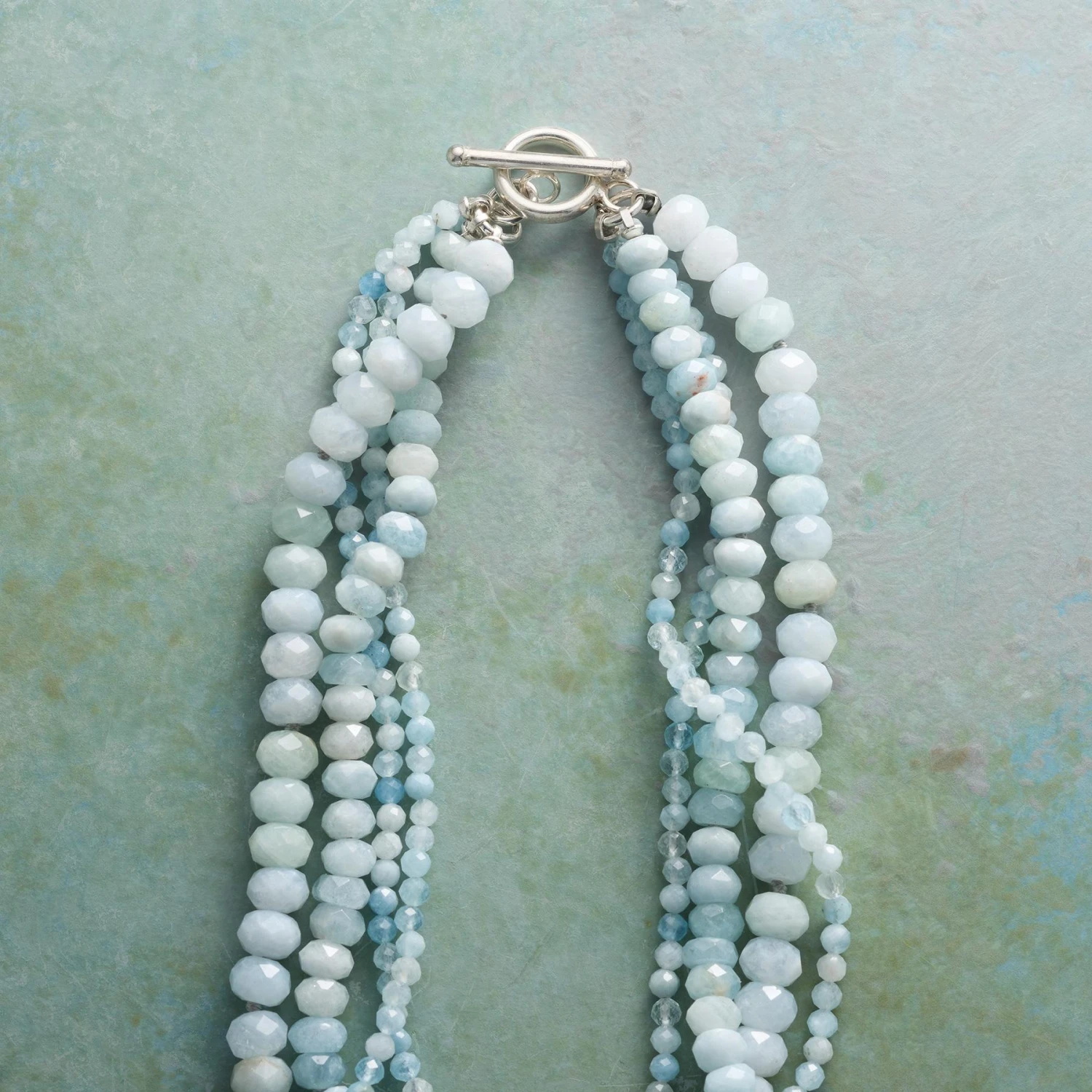 The soothing blues of aquamarine, four strands in all, calm the soul and charm the eye in this handcrafted necklace on which a single baroque freshwater pearl glows. Sterling lobster clasp. 18″L.