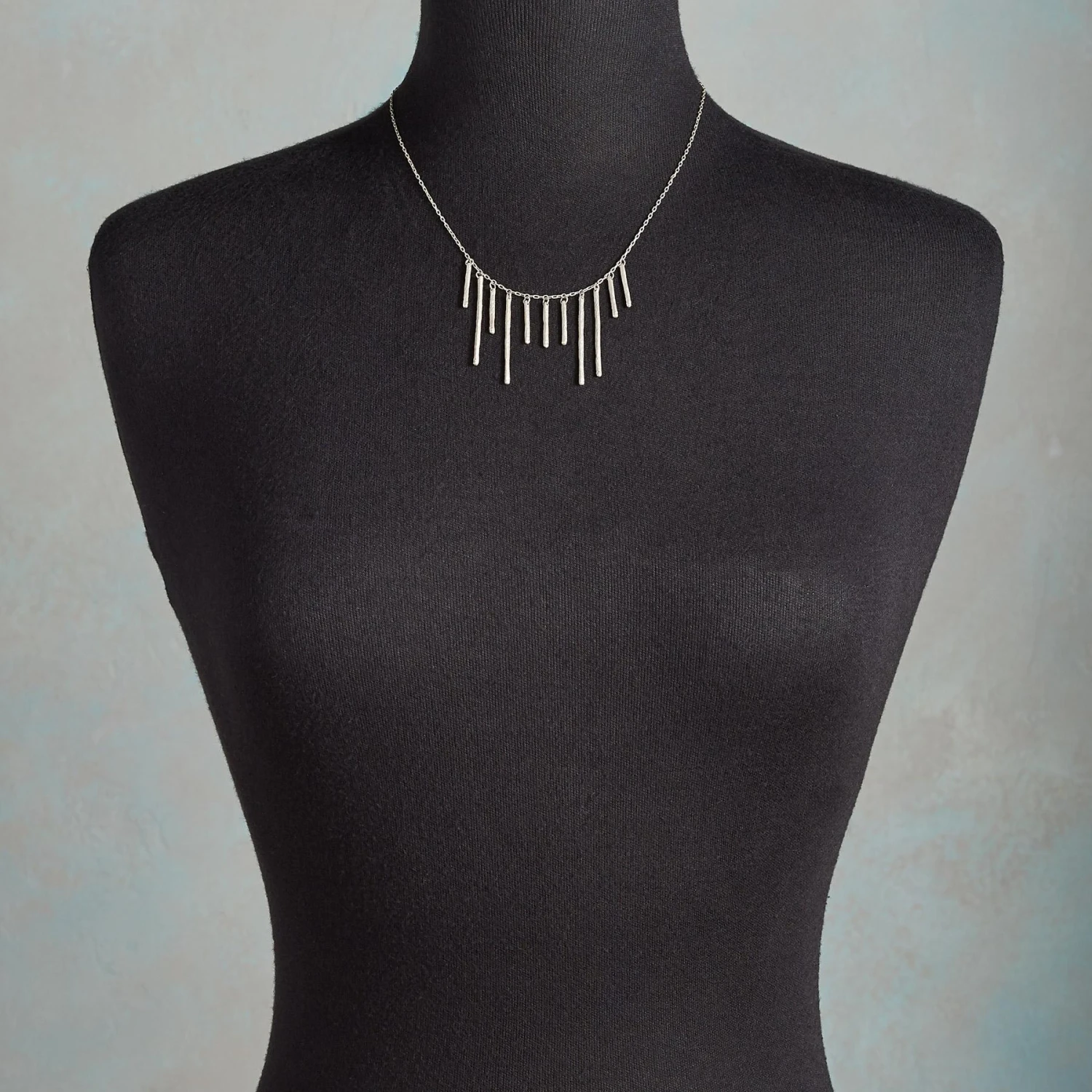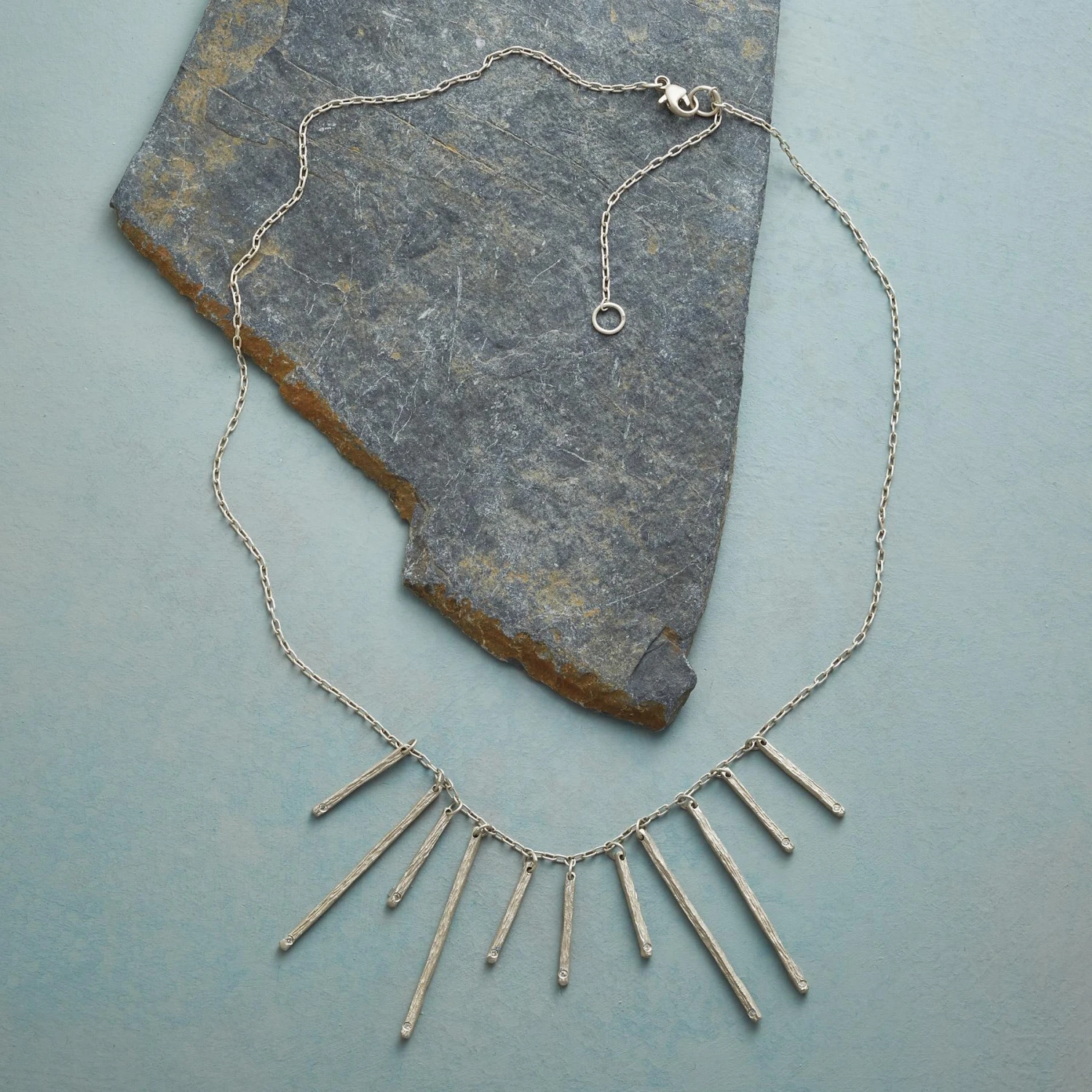 Like artisanal matchsticks individually hewn, each bears a texture sparked by the light of a diamond. Handmade in USA by Saundra Messinger. Sterling silver; lobster clasp. 16″ to 18″L.