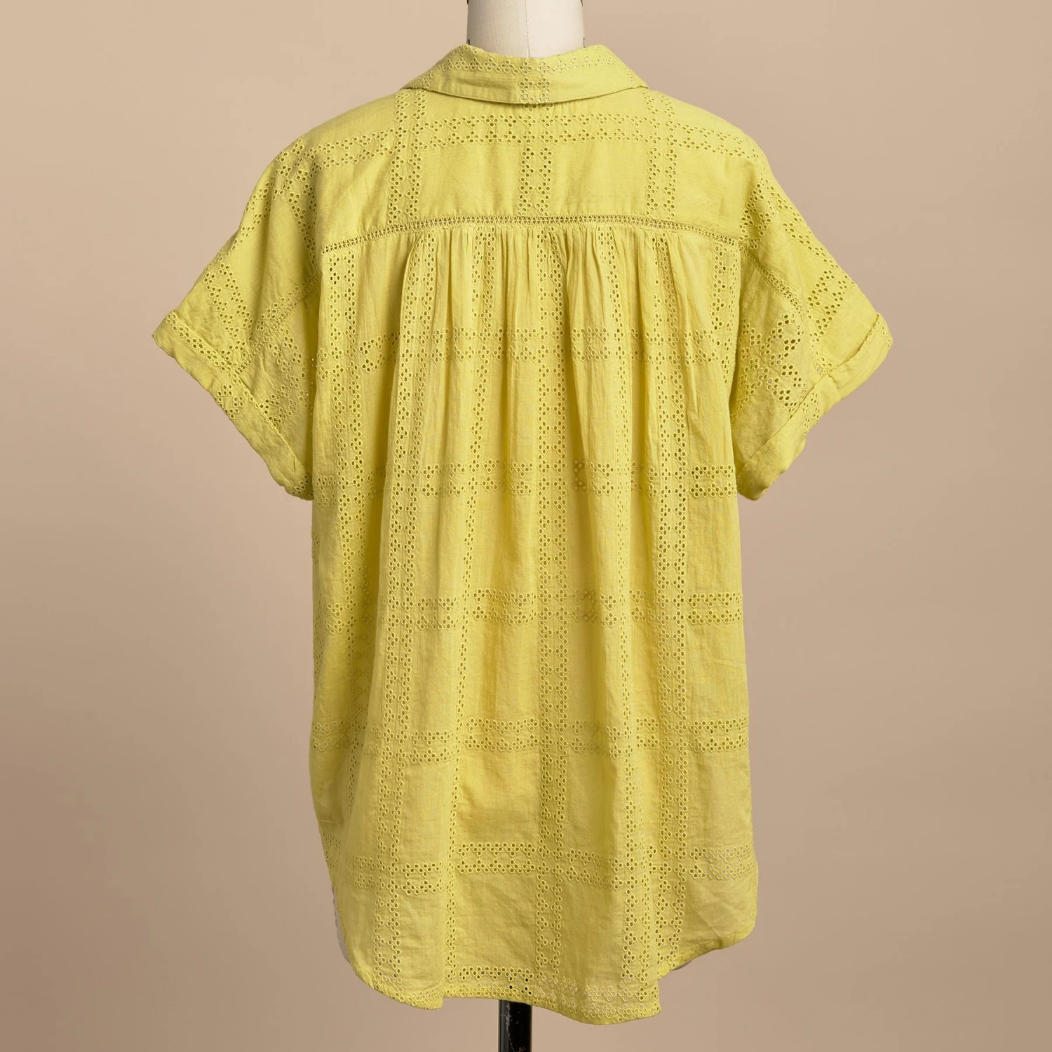Easy, flowing shirt with allover eyelet, turned-back sleeves and smoked shell buttons. Cotton. Machine wash. Imported. Exclusive. Sizes XXS (00), XS (0 to 2), S (4 to 6), M (8 to 10), L (12 to 14), XL (16 to 18). Approx. 25″L.