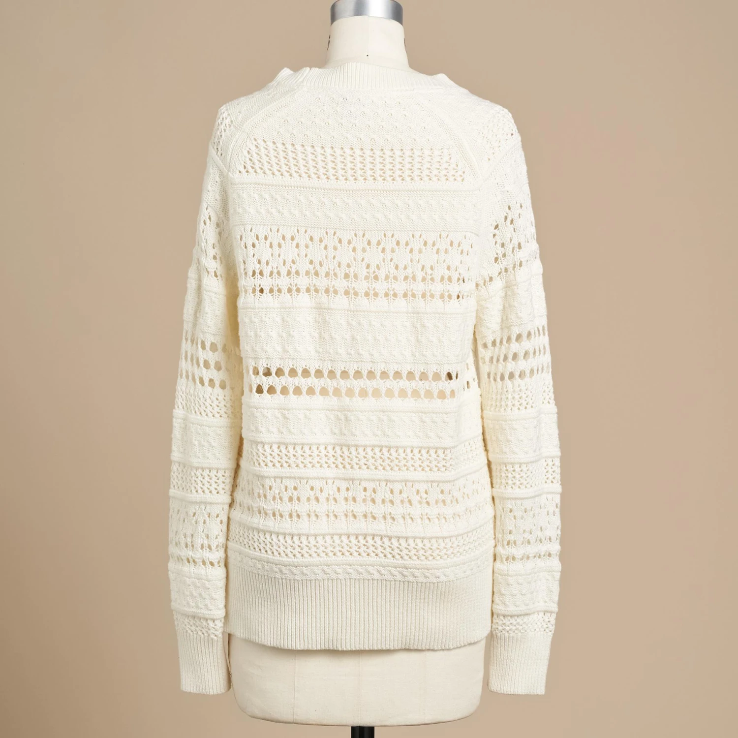 An airy and open, mixed-stitch cardigan with twill tape braided through the body of the sweater for marvelous texture. With rib trim and wooden buttons. Relaxed, easy fit. Cotton/acrylic. Hand wash. Imported. Exclusive. Sizes XXS (00), XS (0–2), S (4–6), M (8–10), L (12–14), XL (16–18). Approx. 22-1/2″l.