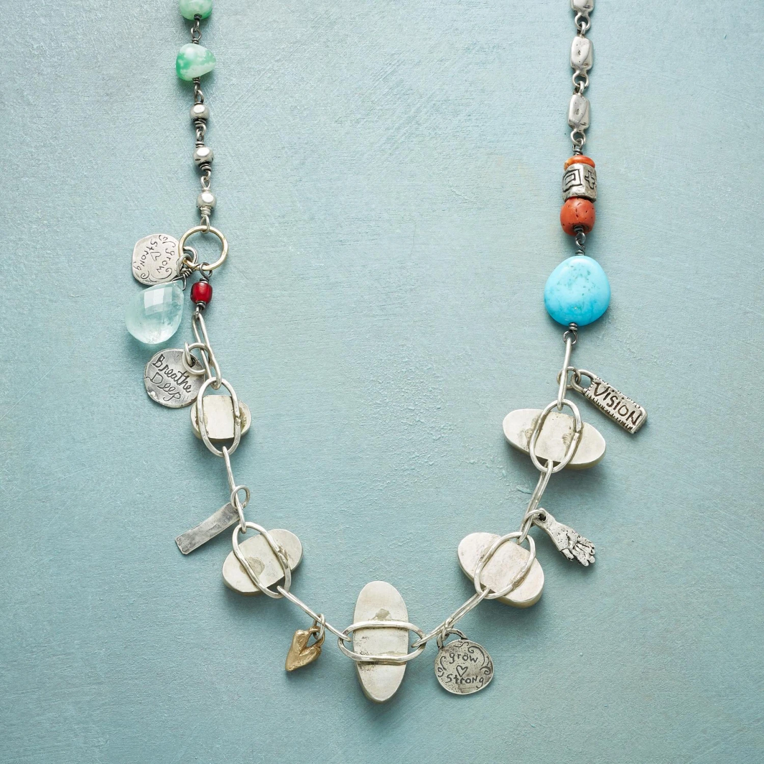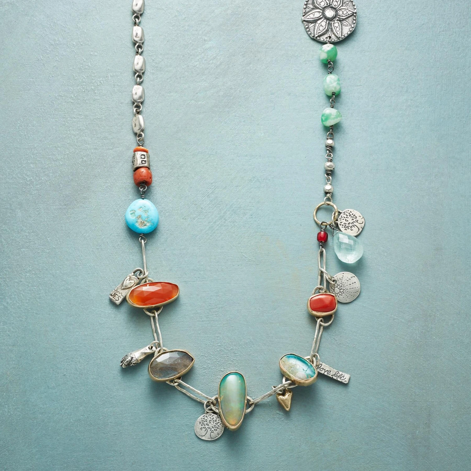 Jes MaHarry mixes stones, metals, charms and chain links with artful abandon to create a necklace as bountiful and beautiful as life itself. Carnelian, opal, emerald, aquamarine, turquoise, labradorite and more are wrapped in 14kt gold and strung on sterling silver. Lobster clasp. Handmade in USA. Exclusive. 22″ to 24″L.