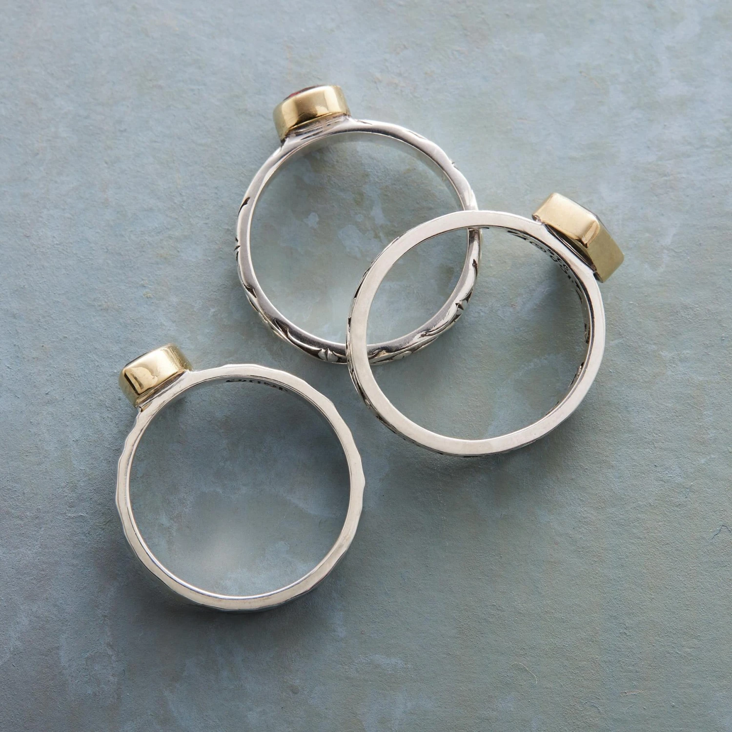 Variations on a theme: Three styles of sterling silver band anchor three cuts of garnet, the gems set in 18kt gold vermeil. A handmade exclusive. Whole sizes 5 to 9. Set of 3. 3/8″ wide when worn together.