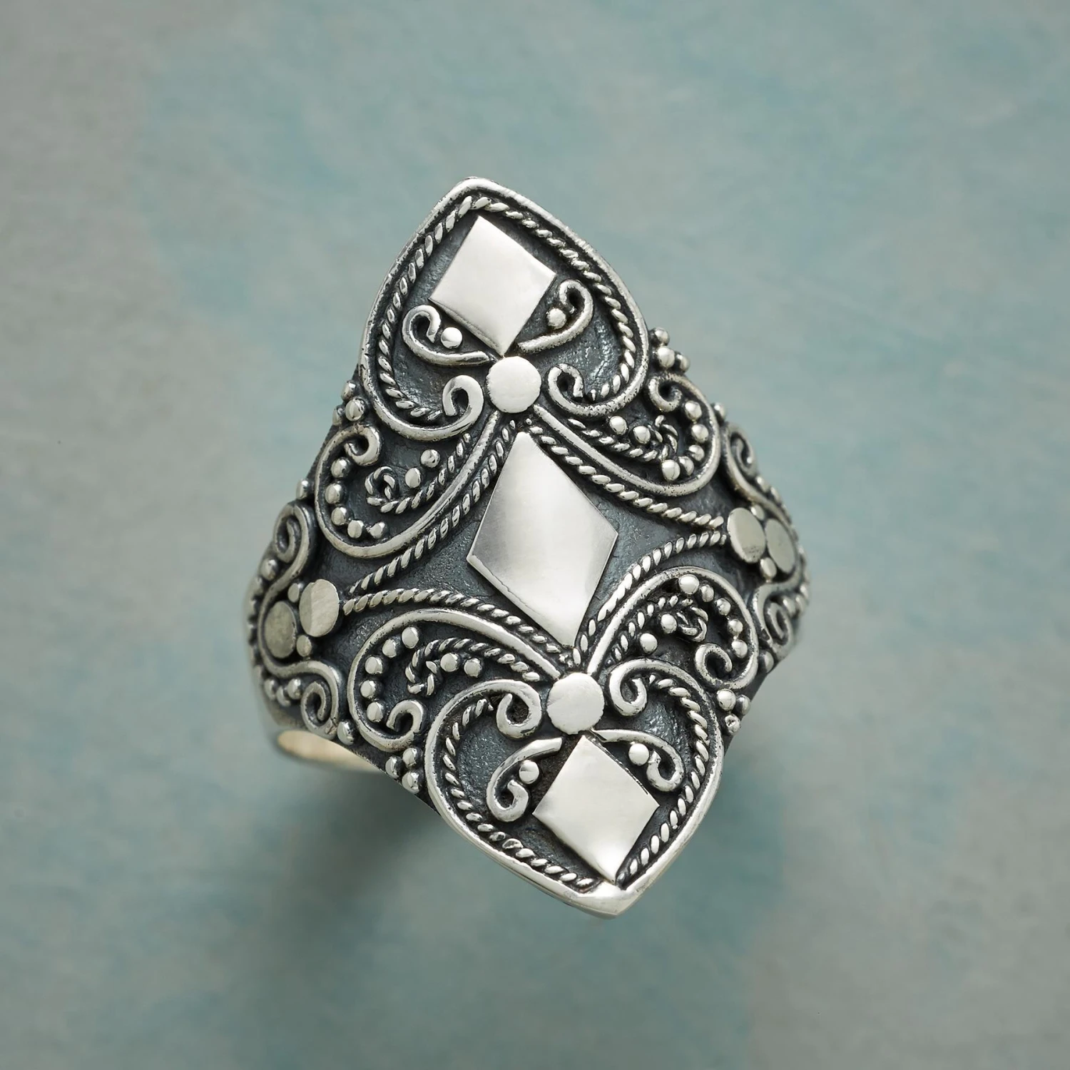A flourish that spans the finger, this empowering design appears inspired by ancient shield motifs. Handcrafted in sterling silver, oxidized to emphasize bas-relief details. Whole sizes 5 to 10. Tapers 1″ to 1/8″W.
