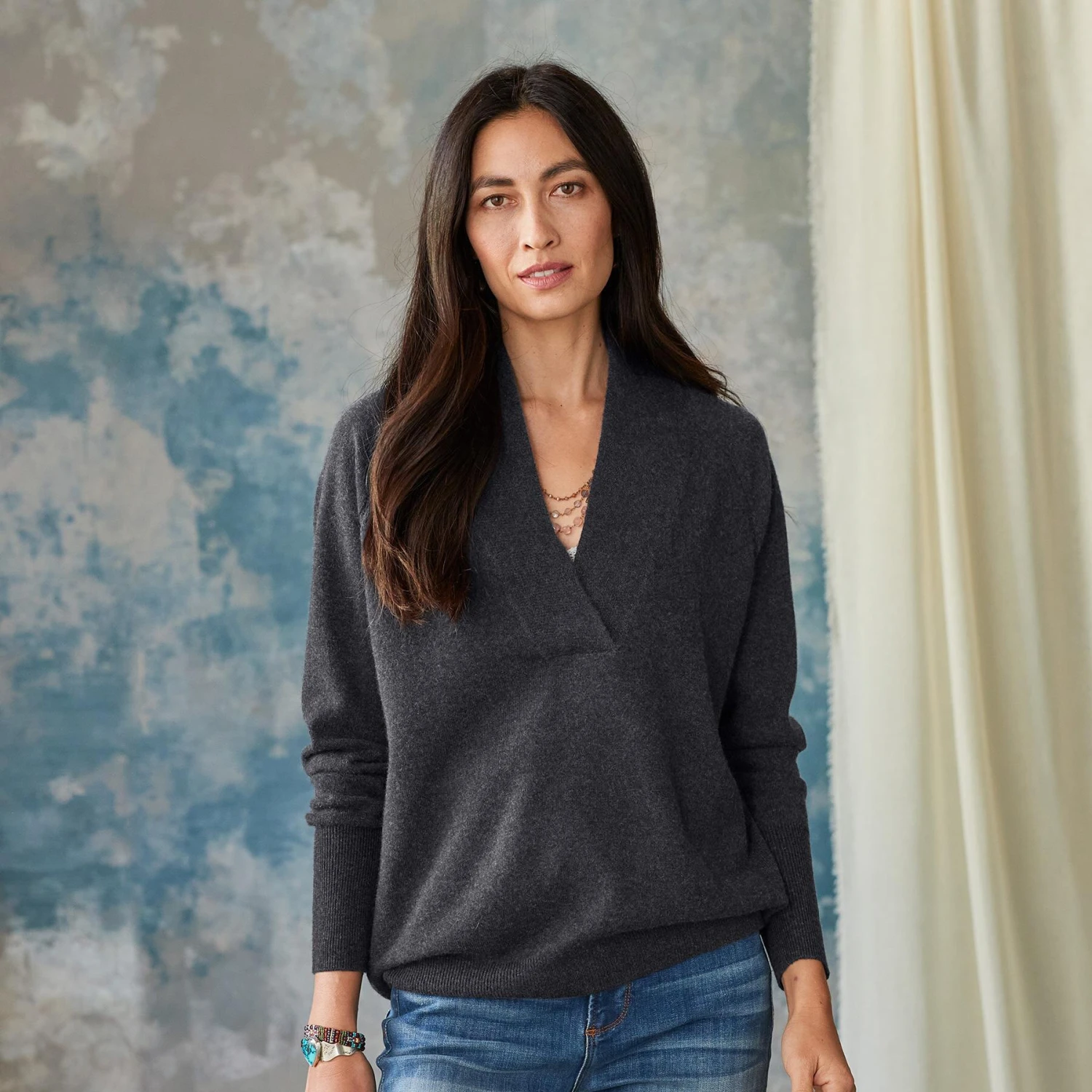 Our cozy, relaxed sweater is simple elegance with shawl collar and rib trim. Cashmere. Hand wash. Imported. Exclusive. Sizes XS (0-2), S (4-6), M (8-10), L (12-14), XL (16-18), XXL (20-22). Approx. 25″l.